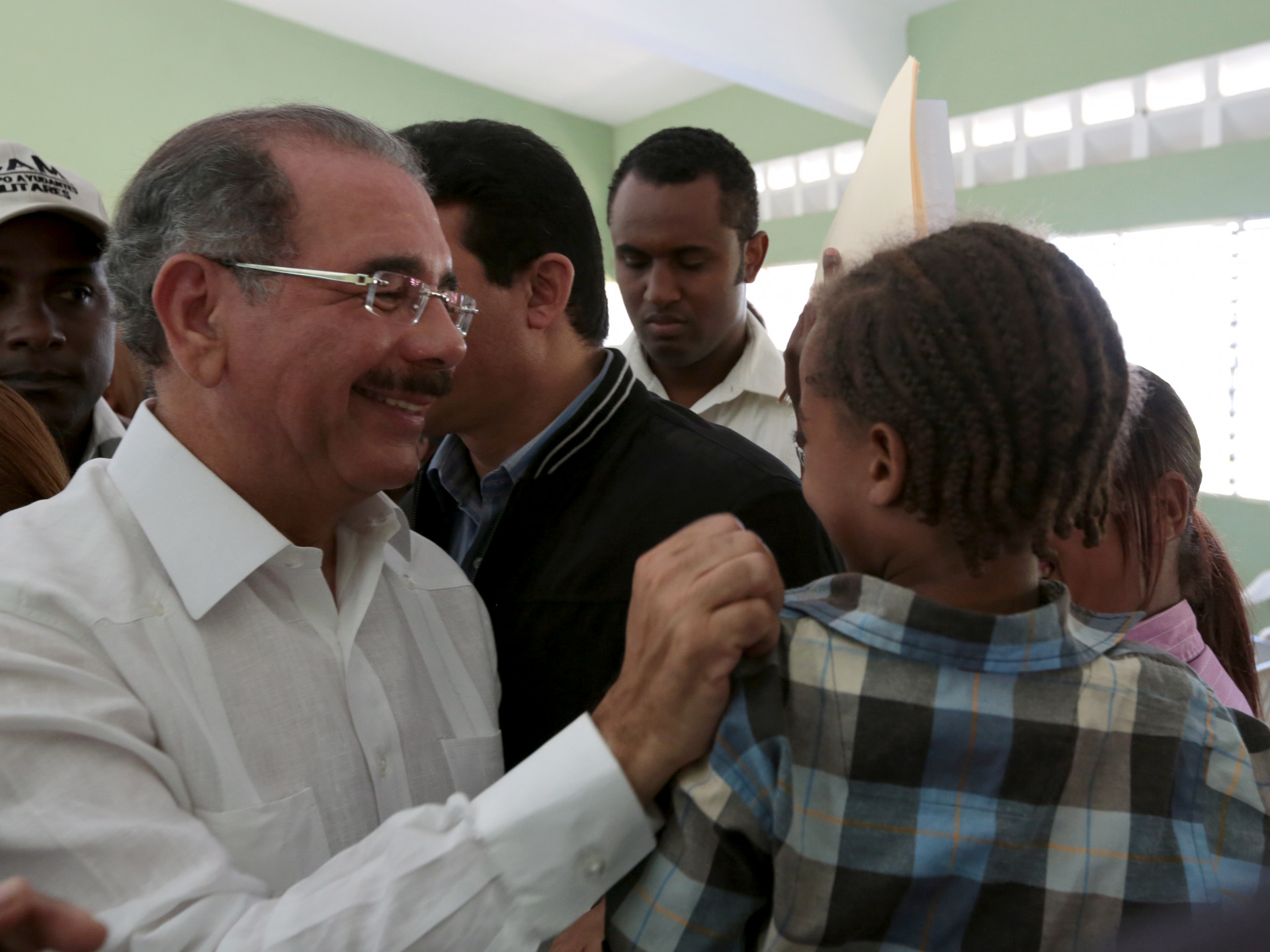 El presidente Danilo Medina saluda niños en brazos de su madre, en la comunidad Yaque del municipio Bohechío.