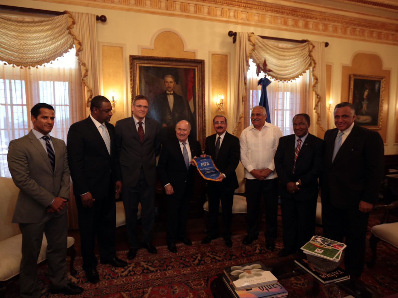 El presidente Danilo Medina recibe un banderín de la Federación Internacional de Fútbol (FIFA), en el Palacio Nacional, de manos de Joseph S. Blatter, presidente de esa organización deportiva. Le acompañan, Jerme Valcke, secretario de la FIFA; Jeffrey Webb, presidente de la Confederación de Fútbol de Norte, Centroamérica y el Caribe (Concacaf); Marcos Díaz, viceministro de Deportes; (a su izquierda) Jaime David Fernández Mirabal, ministro de Deportes y Recreación; Osiris Guzmán, presidente de la Federación Dominicana de Fútbol; y Luisín Mejía, presidente del Comité Olímpico Dominicano (COD).