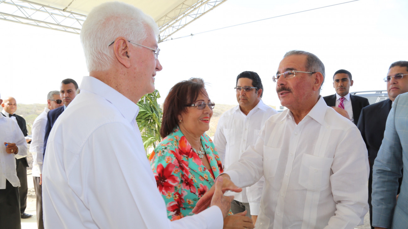 Presidente Danilo Medina mientras saluda a la señora Nelly Melo de Guerrero, gobernadora de Peravia; Wilton Guerrero, senador, así como directivos hoteleros y de los grupos de inversionistas del proyecto turístico, entre otras personalidades presentes en la actividad.