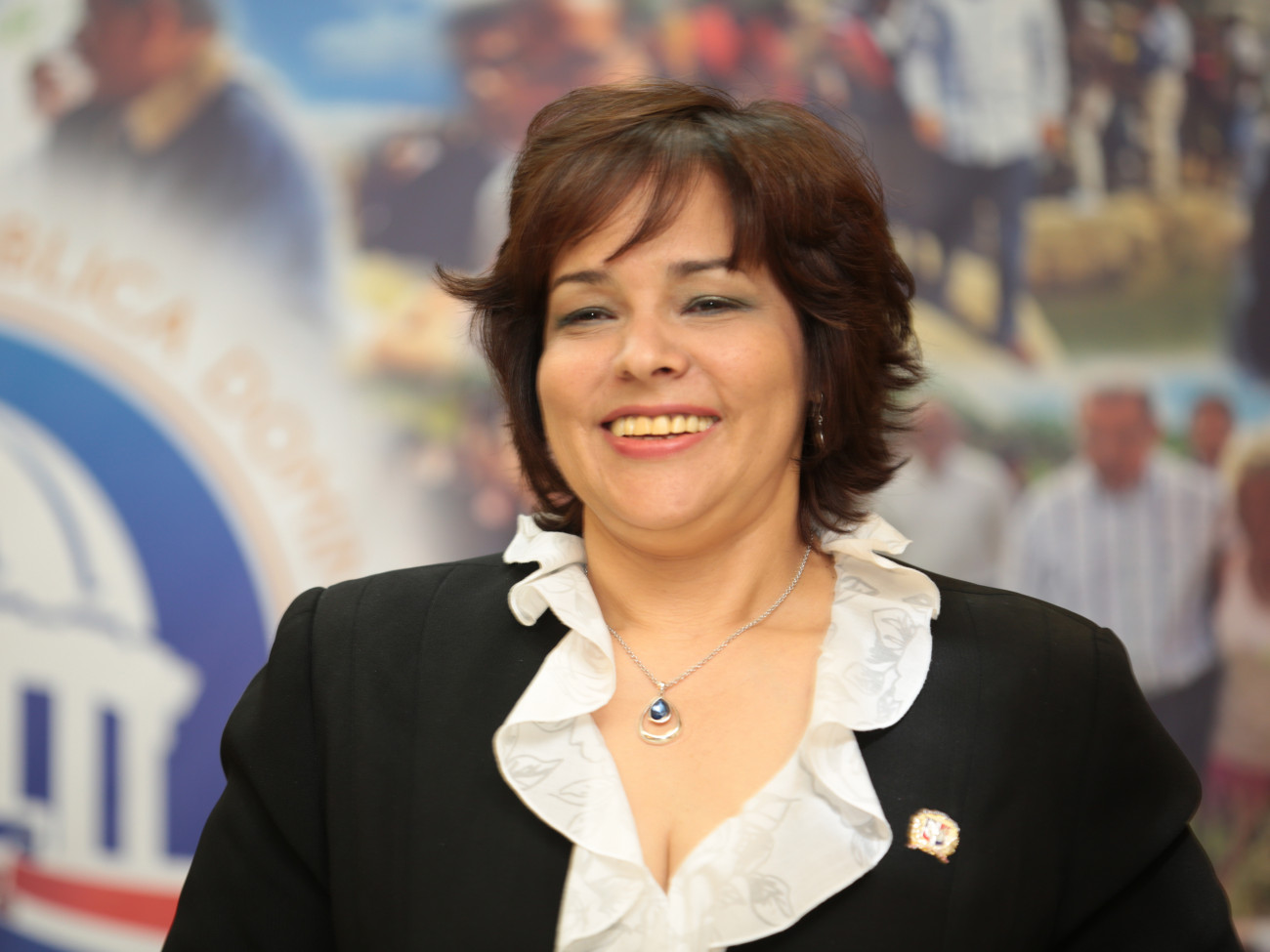 La directora general de Contrataciones Públicas, Yokasta Guzmán Santos, muestra satisfacción tras concluir su participación en el Encuentro con los Medios que organiza la Dirección General de Comunicación (DICOM), en el Palacio nacional.