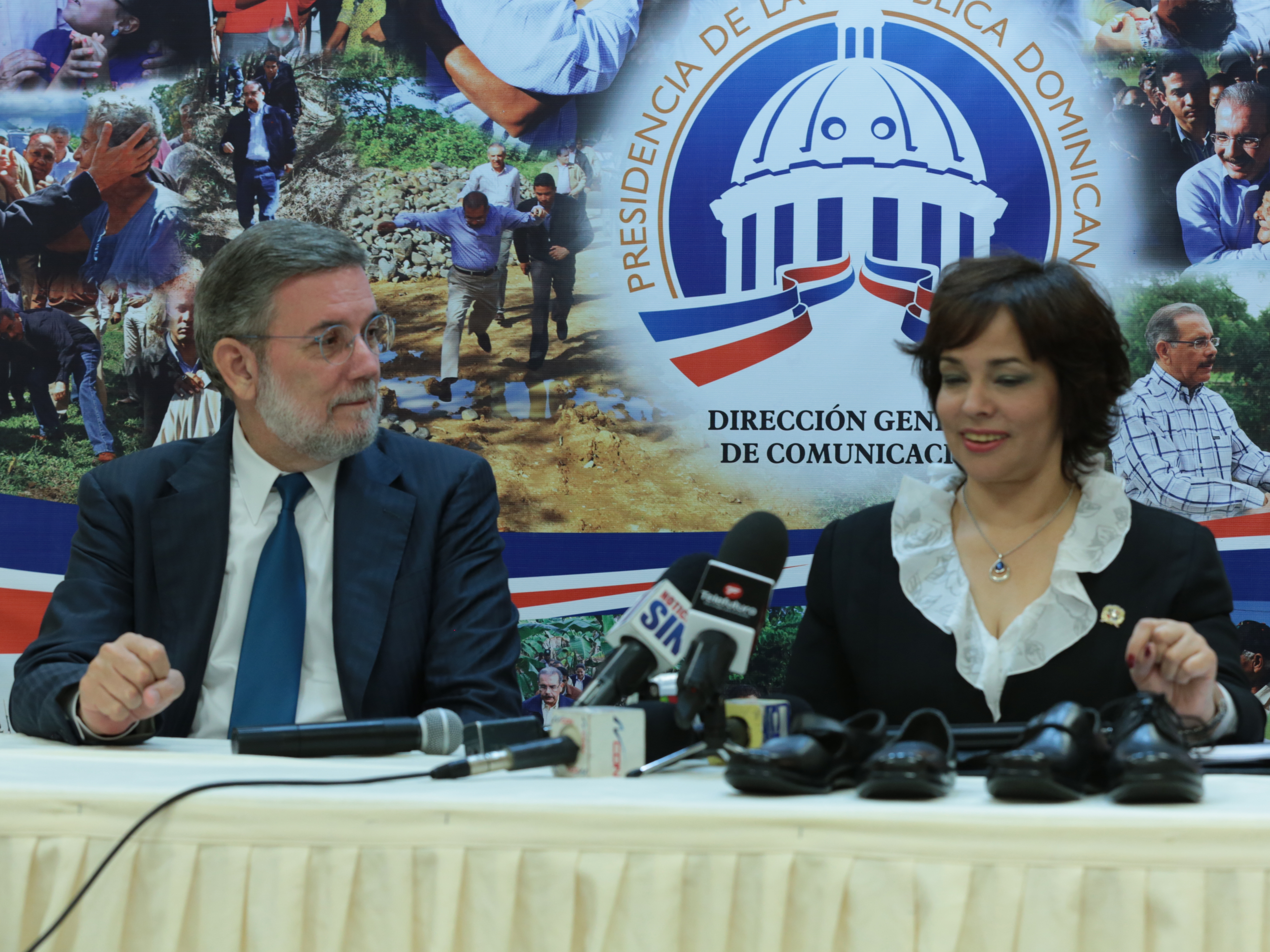 La directora de Contrataciones Públicas, Yokasta Guzmán, muestra, junto a Roberto Rodríguez Marchena, director general de Comunicación de la Presidencia, dos pares de zapatos evidenciando que el Gobierno está inmerso en un amplio y arduo proceso para incentivar a las pequeñas y medianas empresas del país (Pymes), en el marco del Encuentro con los Medios que realiza la Dirección General de Comunicación (DICOM), en el salón Hermanas Mirabal del Palacio Nacional.