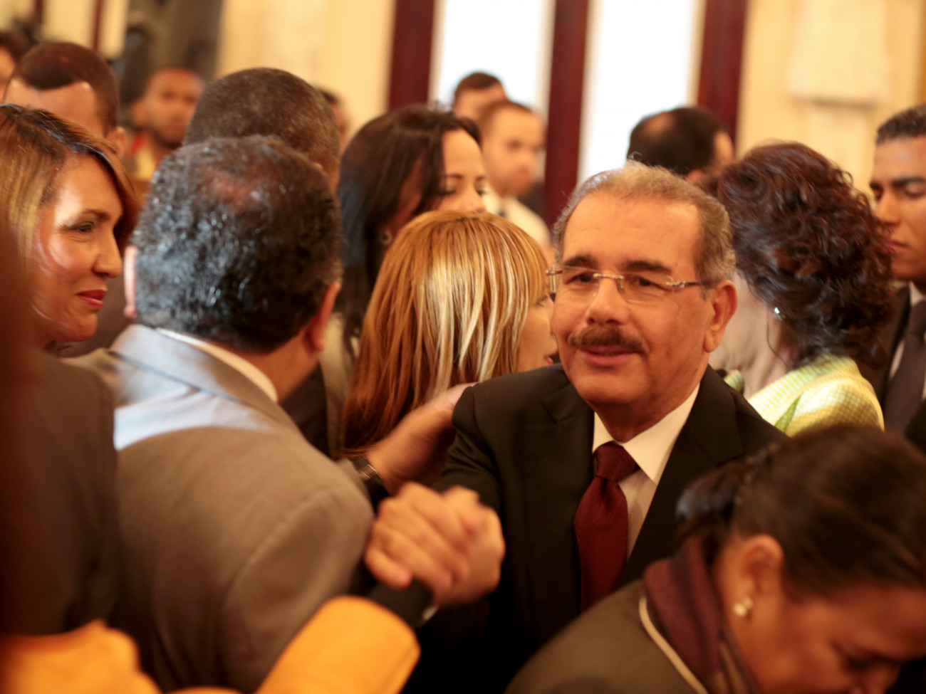 Danilo Medina, presidente de la República, saluda a los invitados al acto solemne, donde el Jefe de Estado puso en marcha el Sistema Nacional de Protección Integral a la Primera Infancia: "Quisqueya Empieza Contigo", en el salón Las Cariátides del Palacio Nacional.
