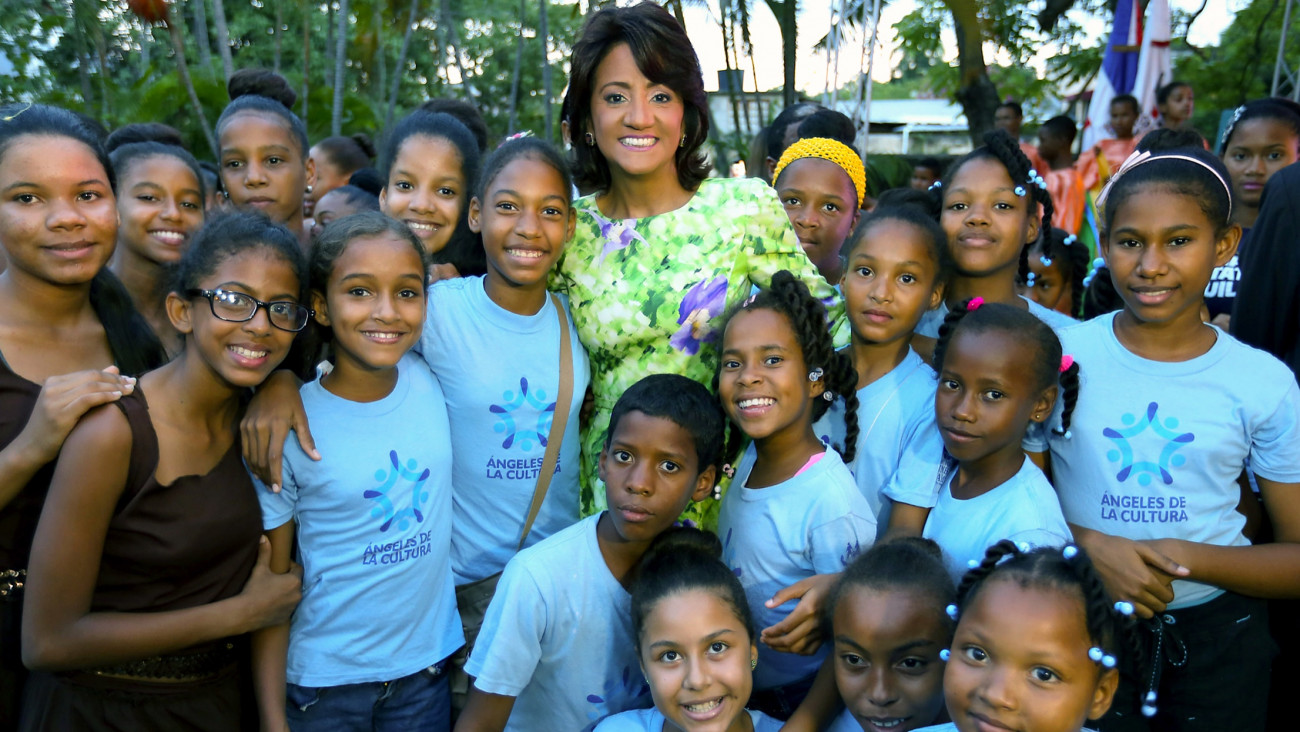 La esposa del presidente de la República, señora Cándida Montilla de Medina acompañada de niñas y niños integrantes del programa “Ángeles de la Cultura”, que busca dotar de conocimientos en las áreas de danza, música, pintura, teatro-títeres y literatura a niños, niñas y adolescentes de escasos recursos económicos.