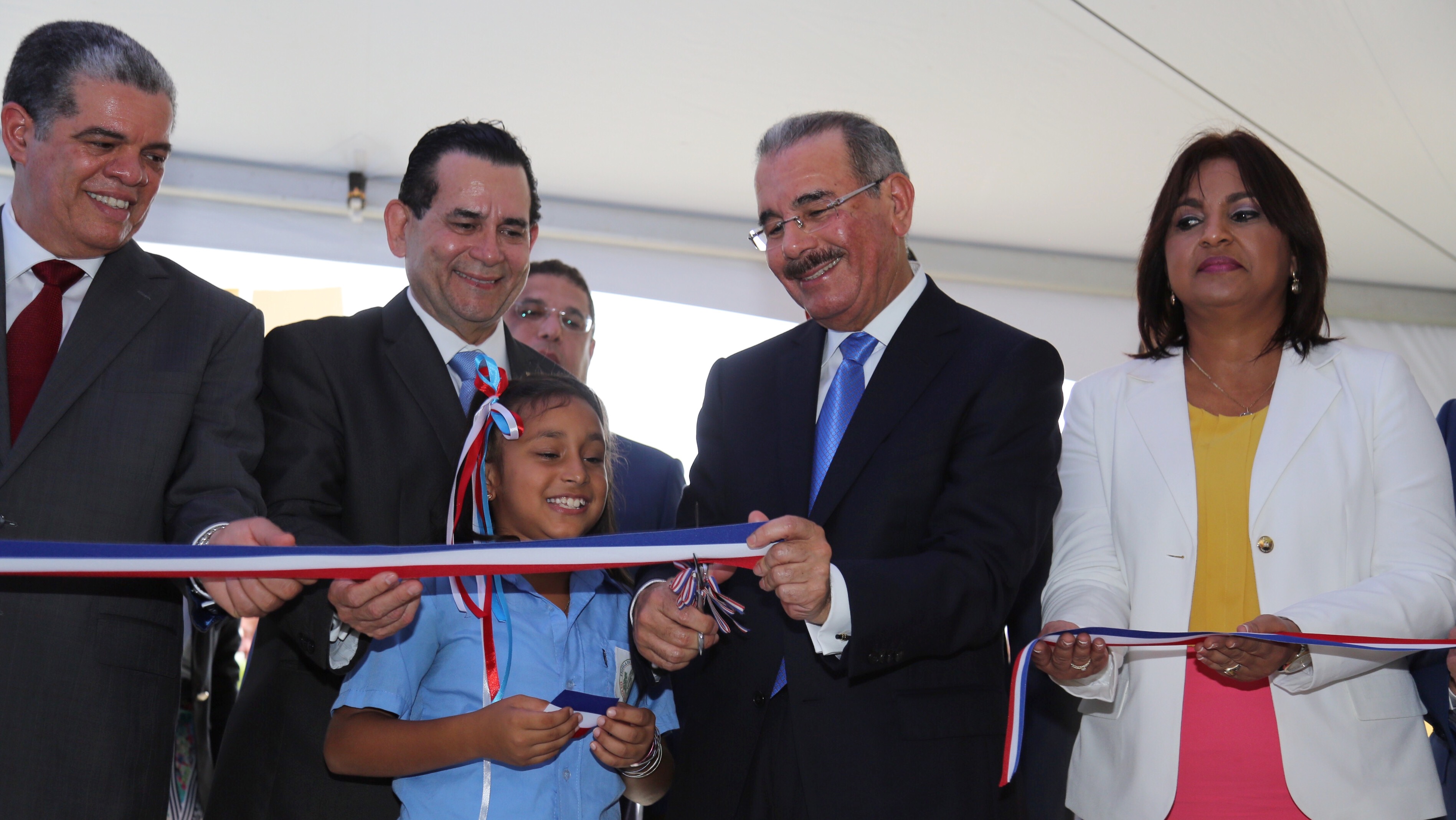 El presidente Danilo Medina corta la cinta durante acto inaugural conjunto de las escuelas San Martín de Porres, en el sector del mismo nombre,y Las Caobas, en Cenoví, San Francisco de Macorís, provincia Duarte.