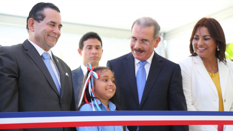El presidente Danilo Medina se dispone a cortar la cinta durante acto inaugural conjunto de las escuelas San Martín de Porres, en el sector del mismo nombre,y Las Caobas, en Cenoví, San Francisco de Macorís, provincia Duarte.
