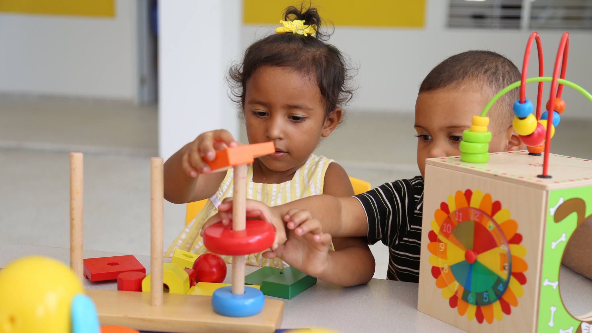 Niñas y niños aprenden mientras se divierten en las instalaciones de la nueva Estancia Infantil Pueblo Nuevo inaugurada hoy por el presidente Medina.