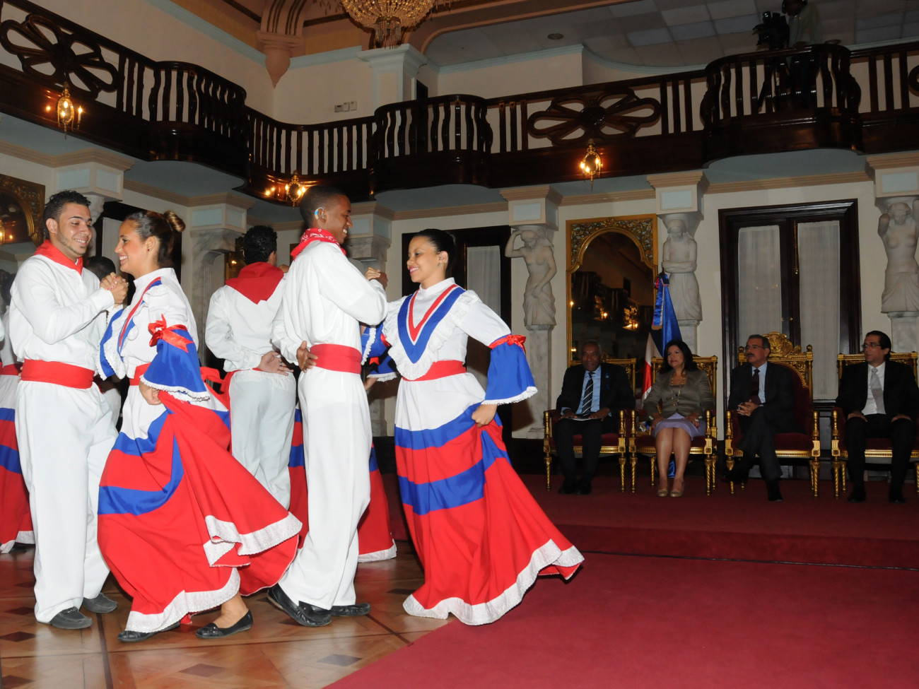 A ritmo de merengue, jóvenes de la Escuela Nacional de Sordomudos, bailan ante los presentes, en el salón Las Cariátides del Palacio Nacional, durante el acto, encabezado por el presidente Medina, donde se ponen en marcha acciones de alfabetización dirigidas a personas con discapacidad.
