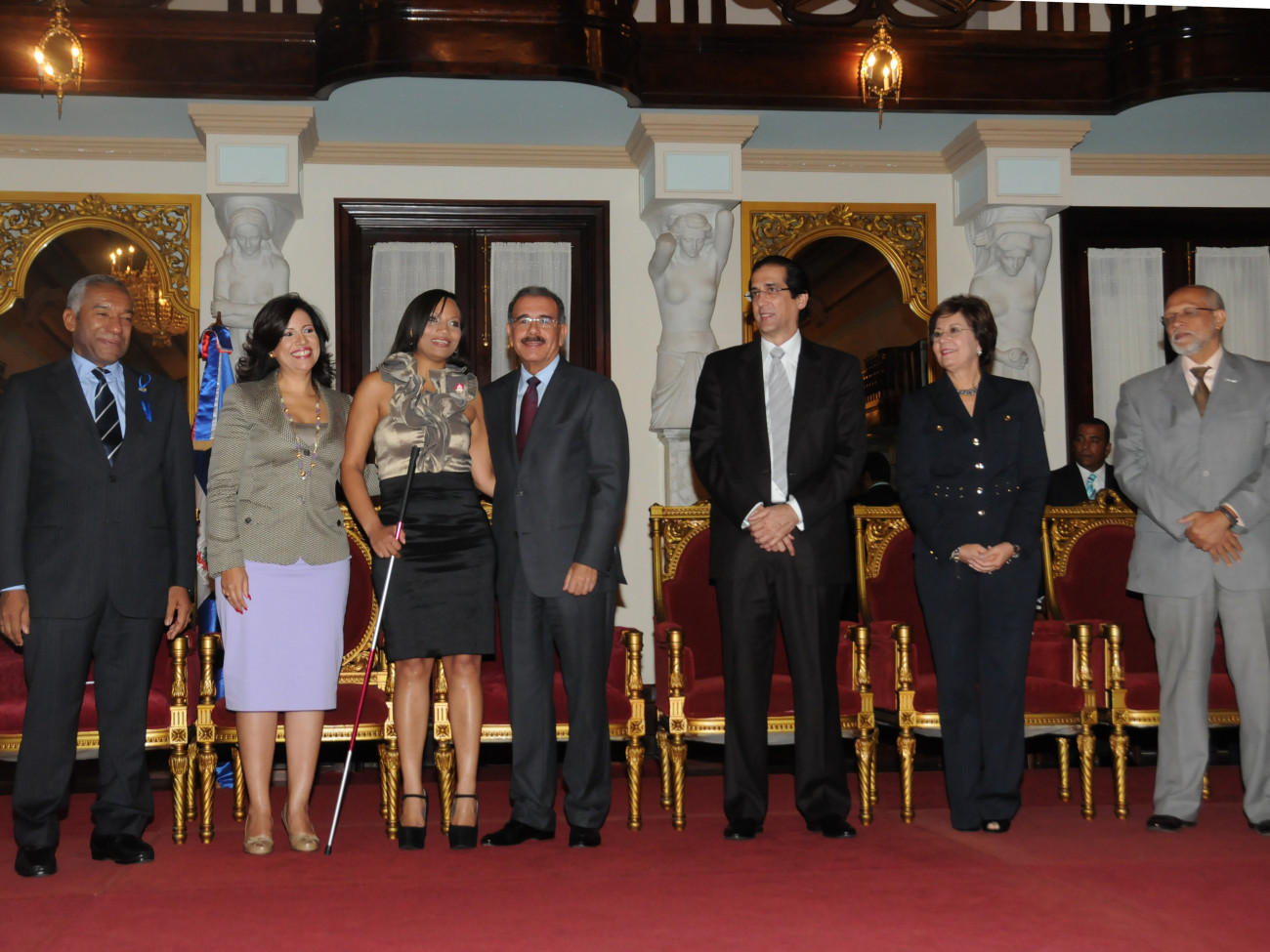 El presidente Danilo Medina junto a Mercedes Toribio, no vidente; la vicepresidenta Margarita Cedeño de Fernández; Magino Corporán, director del Consejo Nacional Sobre Discapacidad (CONADIS); (a su izquierda) el ministro de la Presidencia, Gustavo Montalvo; la ministra de Educación, Josefina Pimentel y Pedro castellanos, director de Programas Especiales de la Presidencia.