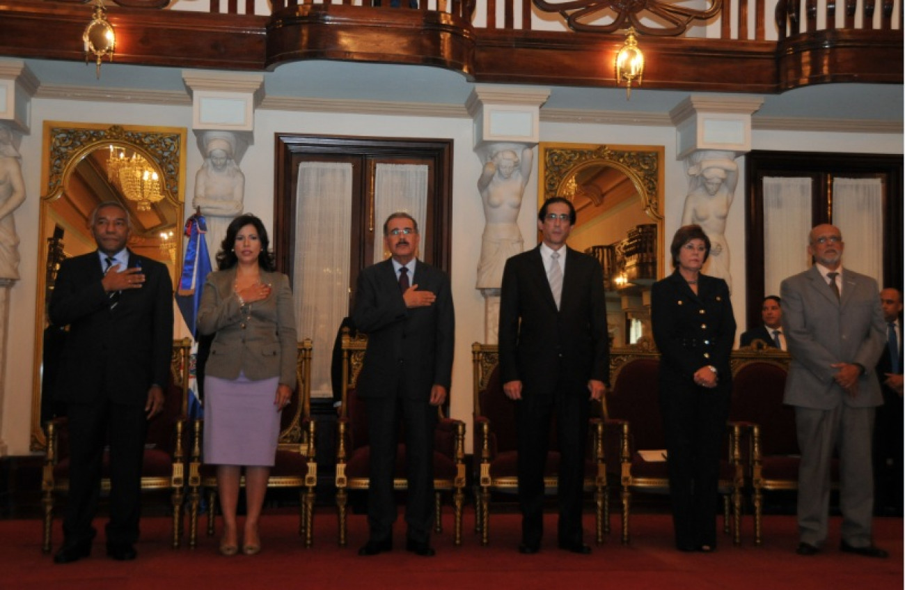 El presidente de la República, Danilo Medina, junto a la vicepresidenta Margarita Cedeño de Fernández; Magino Corporán, director del Consejo Nacional sobre Discapacidad (CONADIS; (a su izquierda) el ministro de la Presidencia, Gustavo Montalvo; la ministra de Educación, Josefina Pimentel y Pedro Castellanos, director de Programas Especiales de la Presidencia, de pies escucha las notas del Himno Nacional.