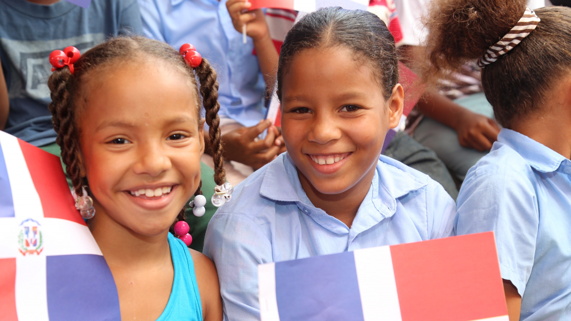 Estudiantes presentes durante acto de inauguración encabezado por el presidente Danilo medina, de la Escuela Básica Pedro Nolasco Núñez, en Canca La Reina, Moca,, que integra 43 aulas al Programa de Tanda Extendida.