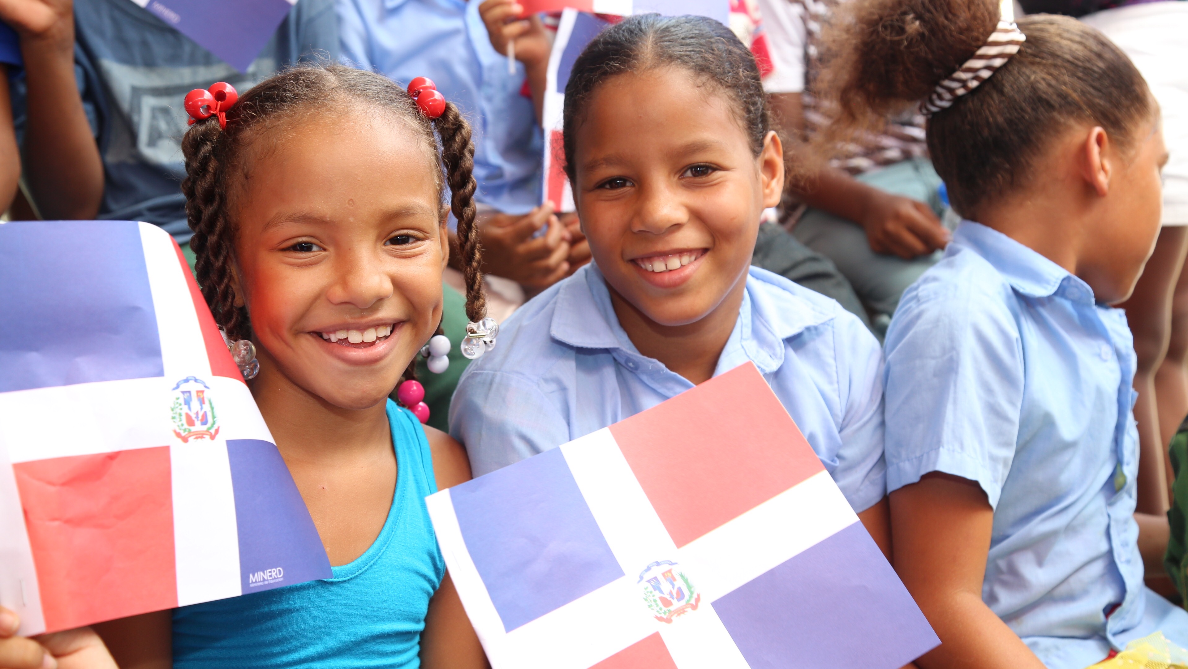 Estudiantes presentes durante acto de inauguración encabezado por el presidente Danilo medina, de la Escuela Básica Pedro Nolasco Núñez, en Canca La Reina, Moca, que integra 43 aulas al Programa de Tanda Extendida.
