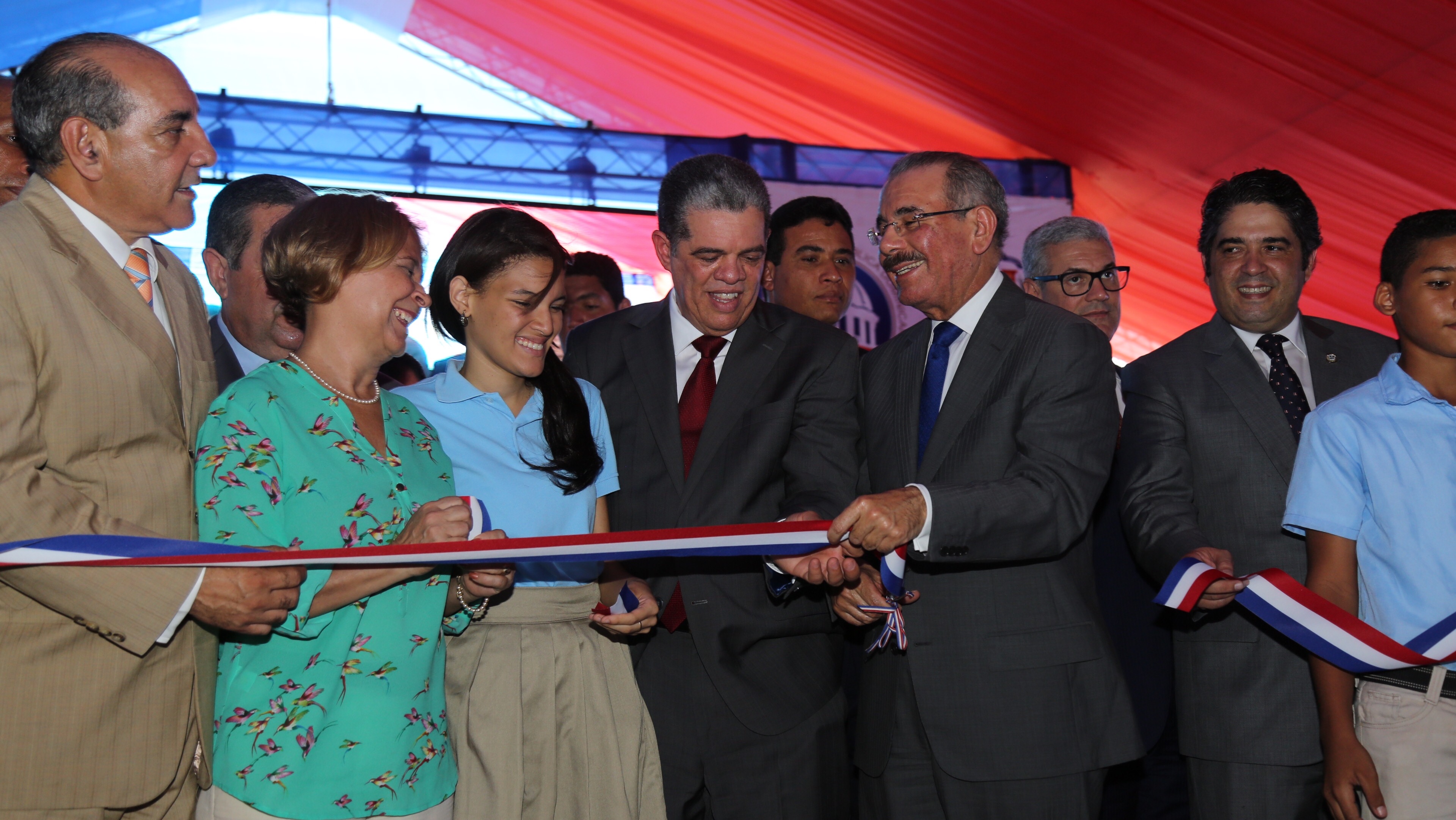 El presidente Danilo medina corta la cinta para dejar inaugurado el centro de estudio junto al ministro de Educación y personalidades presentes en el evento.