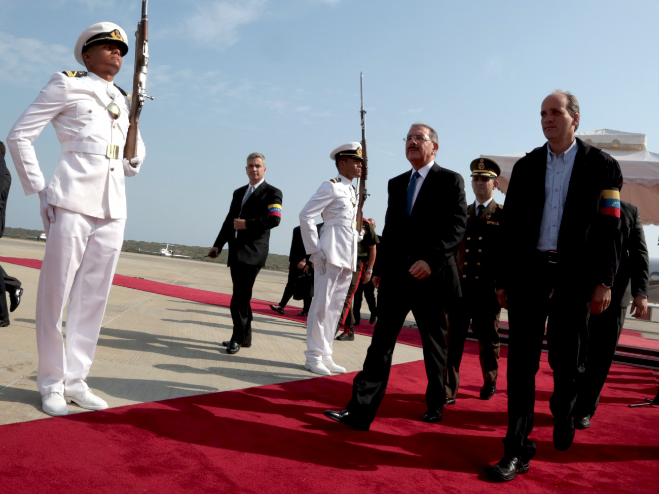 El presidente Danilo Medina es recibido a su llegada al Aeropuerto Internacional de Maiquetía, en Caracas,para participar en los actos de juramentación del mandatario de la República Bolivariana de Venezuela, Nicolás Maduro.