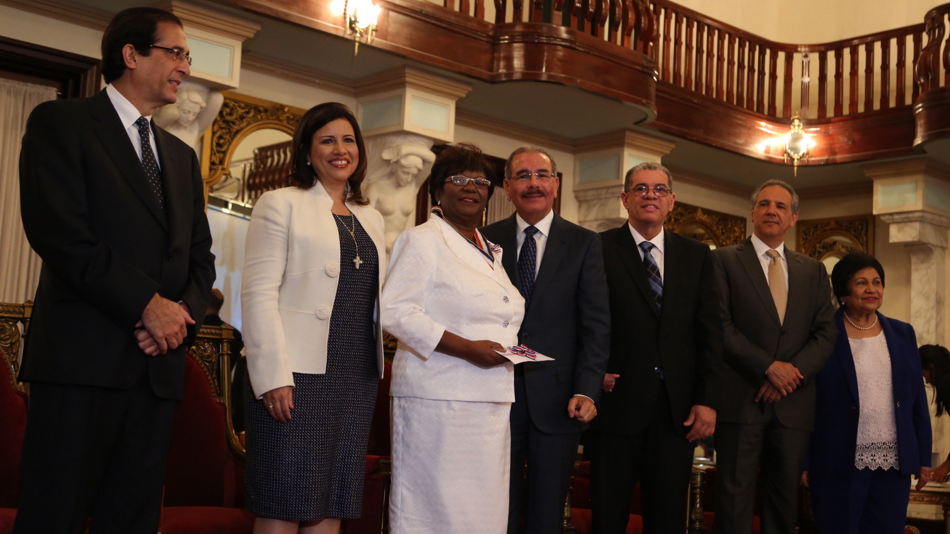 Presidente Danilo Medina junto a la maestra Milagros Quezada, galardonada con la medalla de bronce. Les acompañan la vicepresidenta de la República, Margarita Cedeño, los ministros de la Presidencia Gustavo Montalvo, administrativo de la Presidencia, José Ramón Peralta,de Educación, Carlos AmaranteBaret y la ministra de Educación Superior Ciencia y Tecnología, Ligia Amada Melo