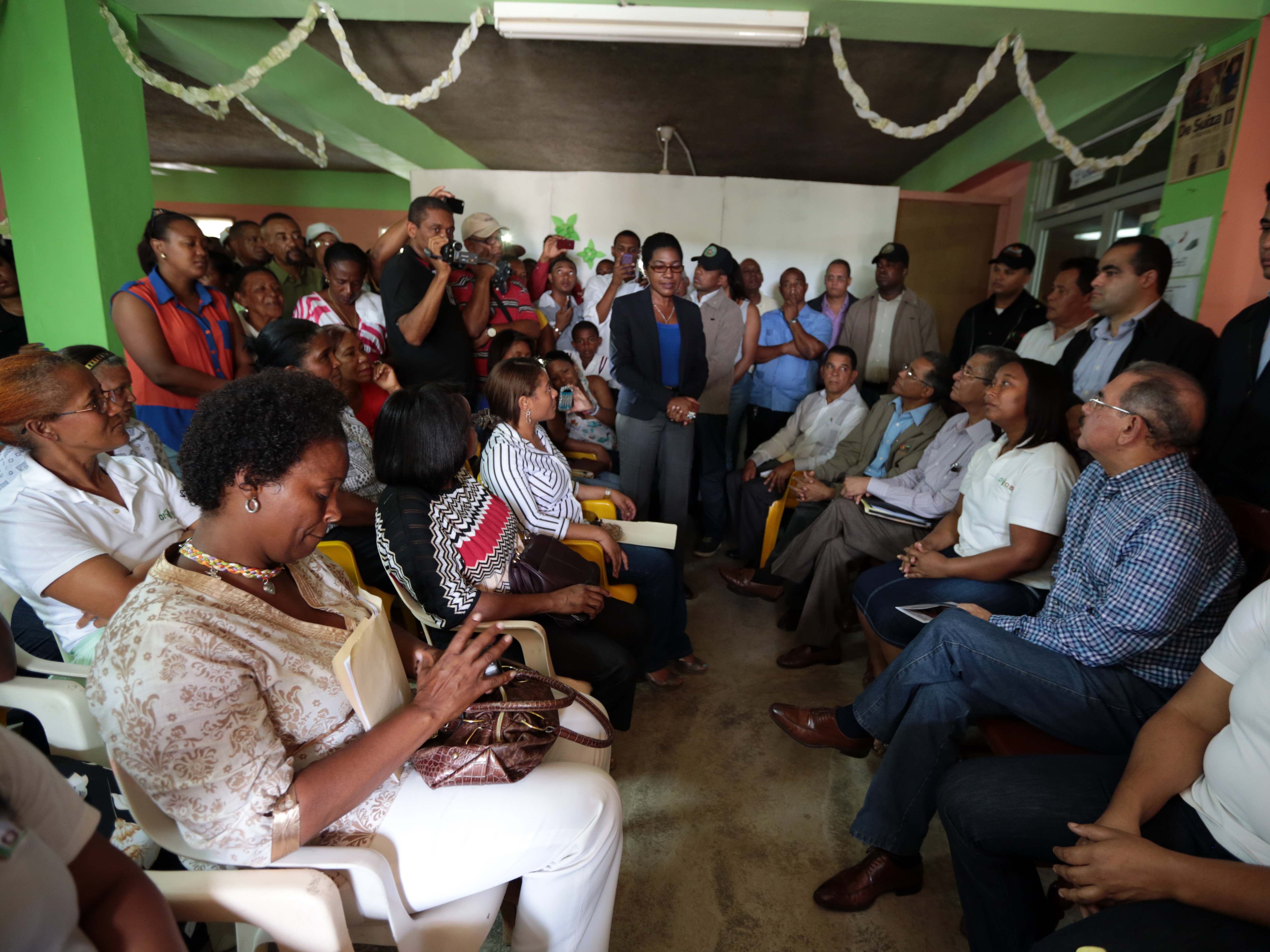 Danilo Medina, presidente de la República, escucha la exposición de esta dama productora de Palmar Grande, del municipio Altamira, Puerto Plata, donde acudió el mandatario, en una visita sorpresa para oír a su gente.