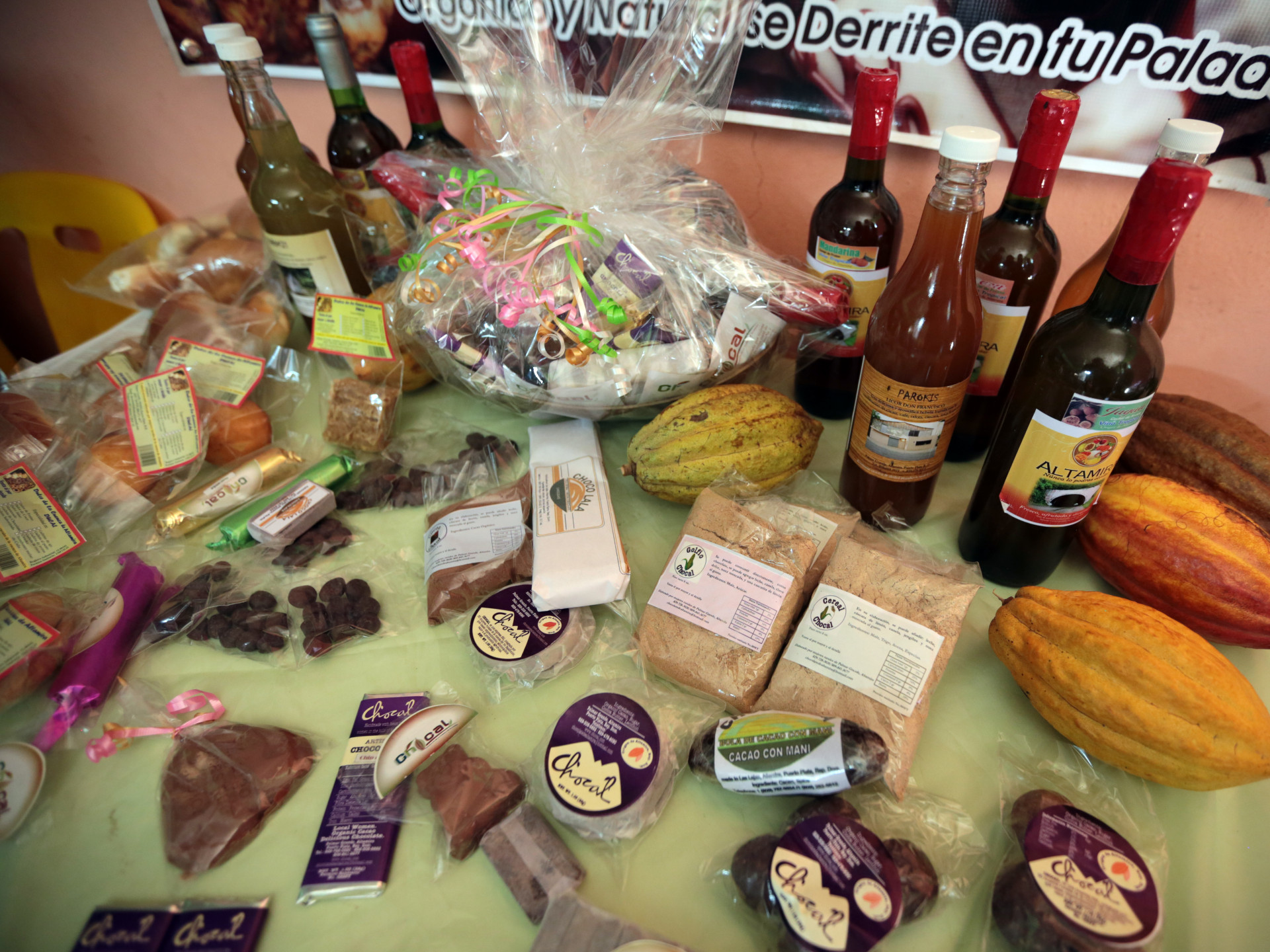 Exhibición de chocolates, yerbas aromáticas, aceites esenciales y bisuterías que producen mujeres de Palmar Grande, del municipio Altamira, en la provincia Puerto Plata.