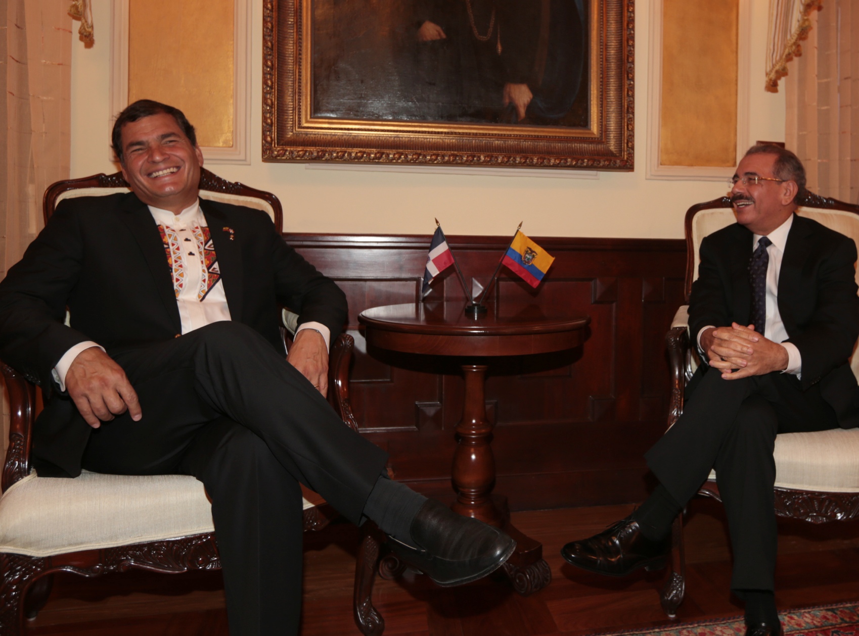 El presidente de la República Dominicana, Danilo Medina, (derecha) y el presidente del Ecuador, Rafael Correa, conversan animadamente, en el despacho de Medina, en el Palacio Nacional.