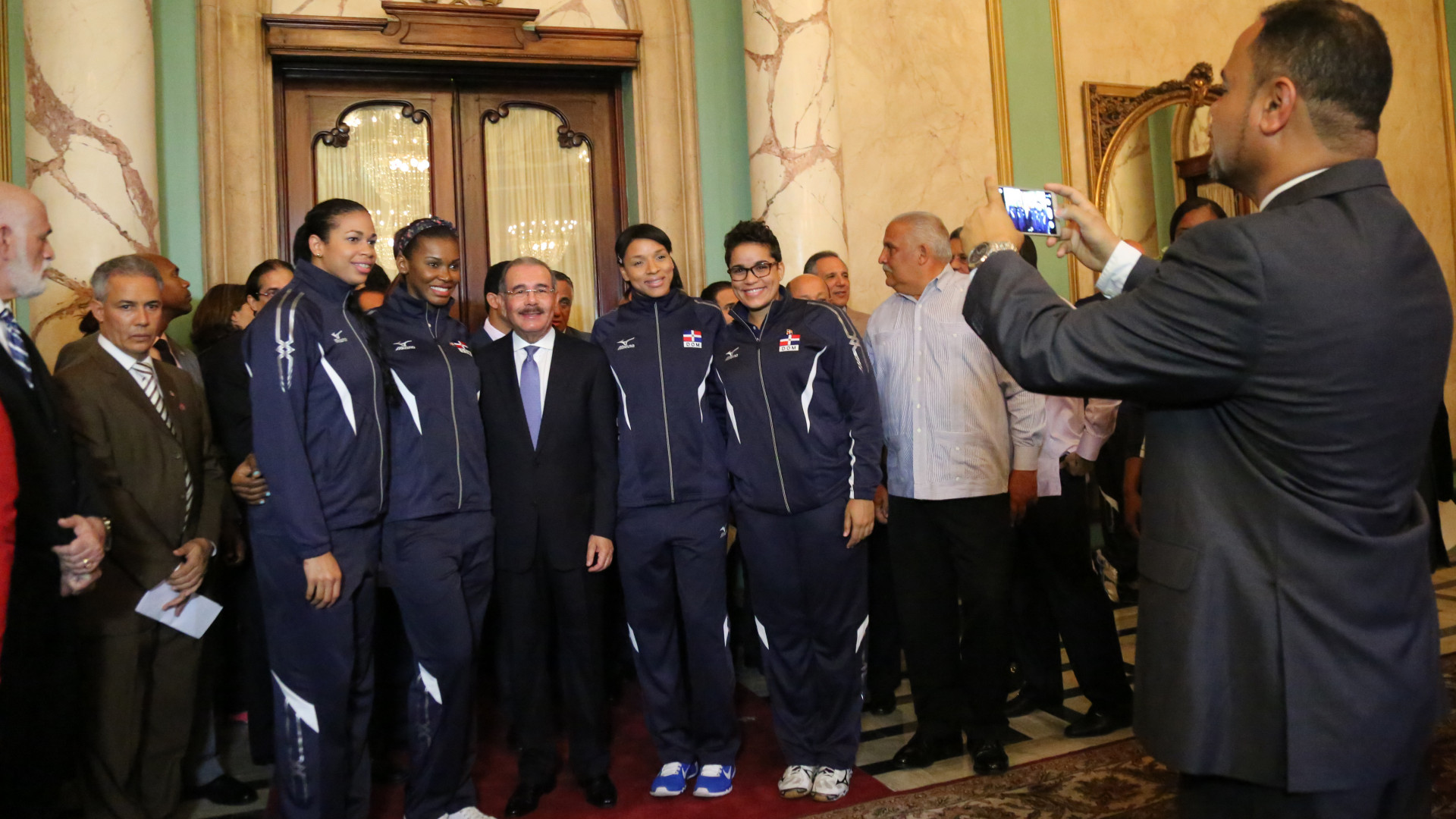 El presidente Danilo Medina junto a atletas y personal técnico que integran la delegación dominicana que participarán en los Juegos Panamericanos Toronto 2015.