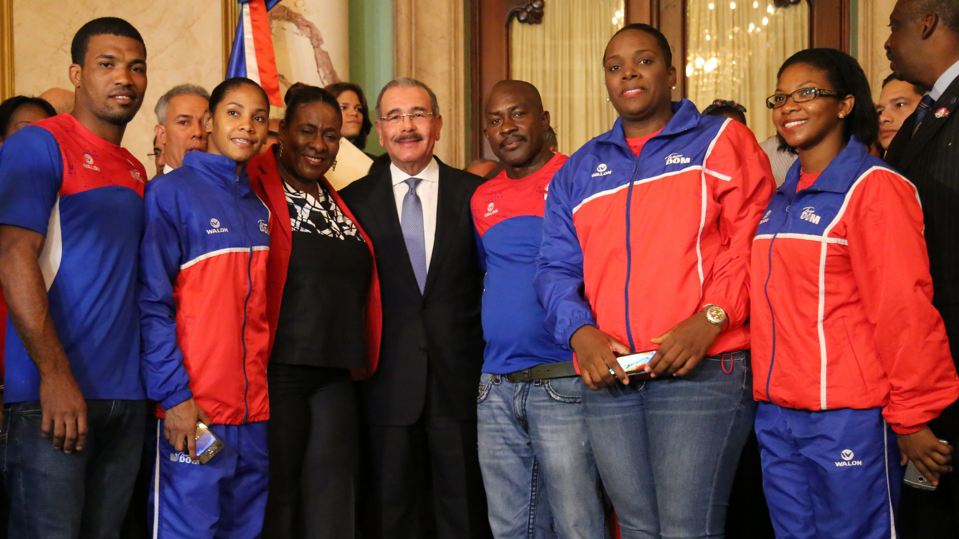 El presidente Danilo Medina junto a atletas y personal técnico que integran la delegación dominicana que participarán en los Juegos Panamericanos Toronto 2015.