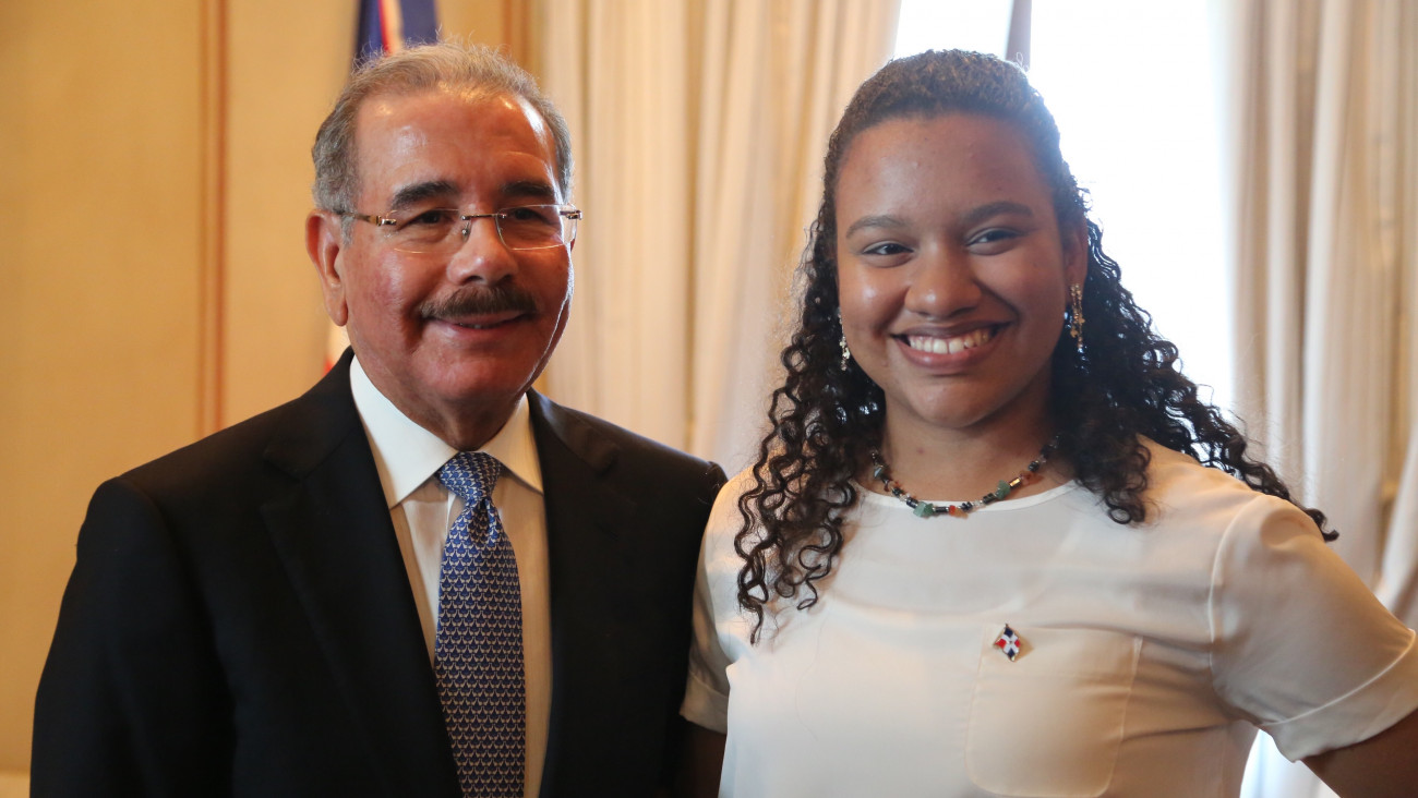 Presidente Danilo Medina y estudiante dominicana meritoria de Nueva York, durante visita de cortesía al Palacio Nacional.