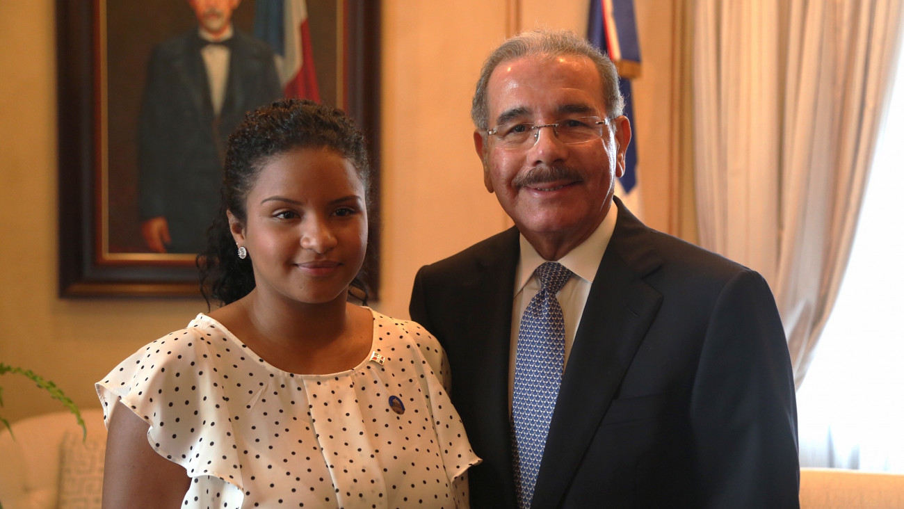 Presidente Danilo Medina y estudiante dominicana meritoria de Nueva York, durante visita de cortesía al Palacio Nacional.