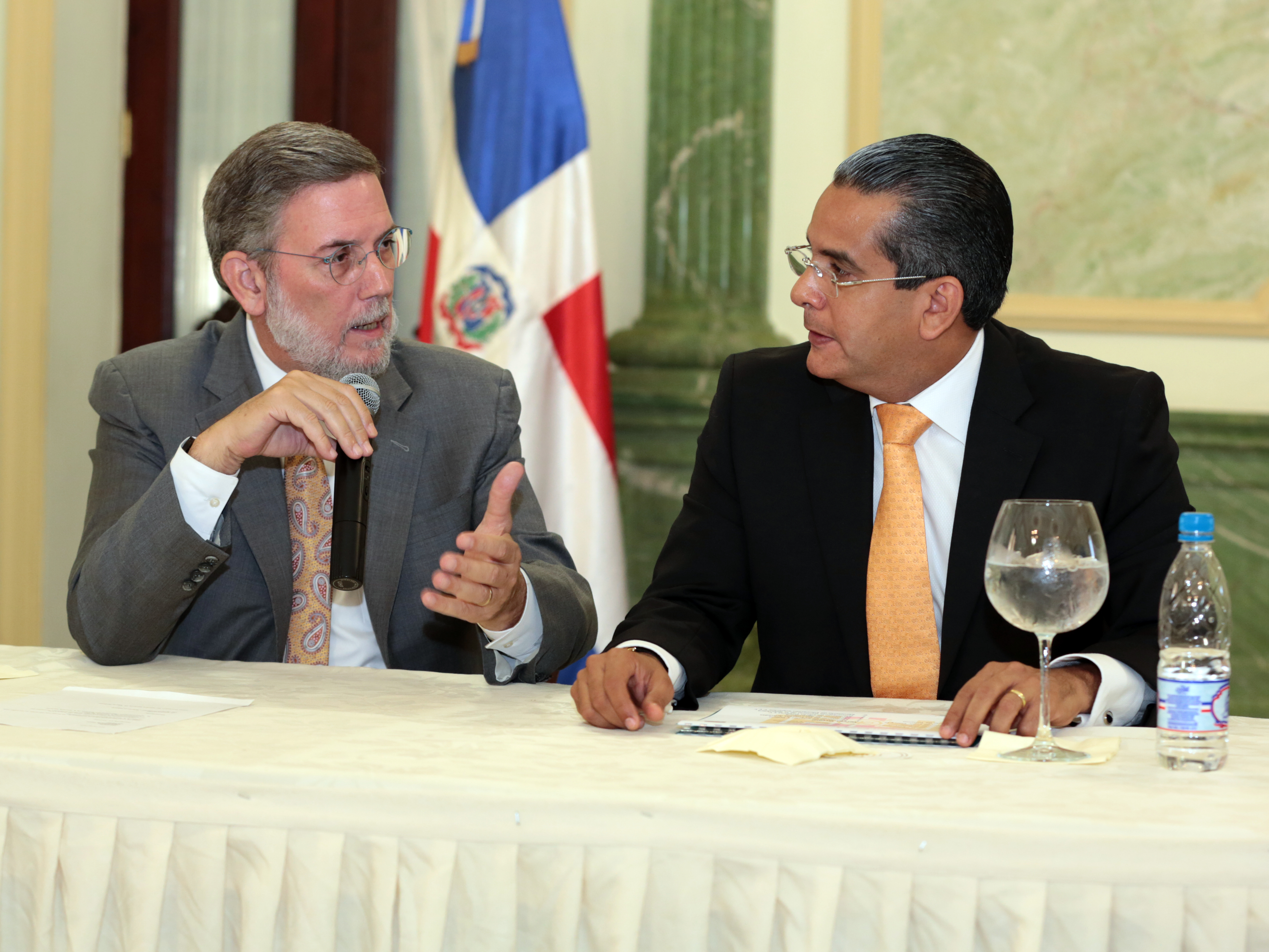 Roberto Rodríguez Marchena, director general de Comunicación de la Presidencia (izquierda), junto al tesorero nacional, Alberto Perdomo, responde a un periodista, en el Encuentro Semanal con los Medios de Comunicación, que organiza la DICOM, en el salón Hermanas Mirabal del Palacio Nacional.