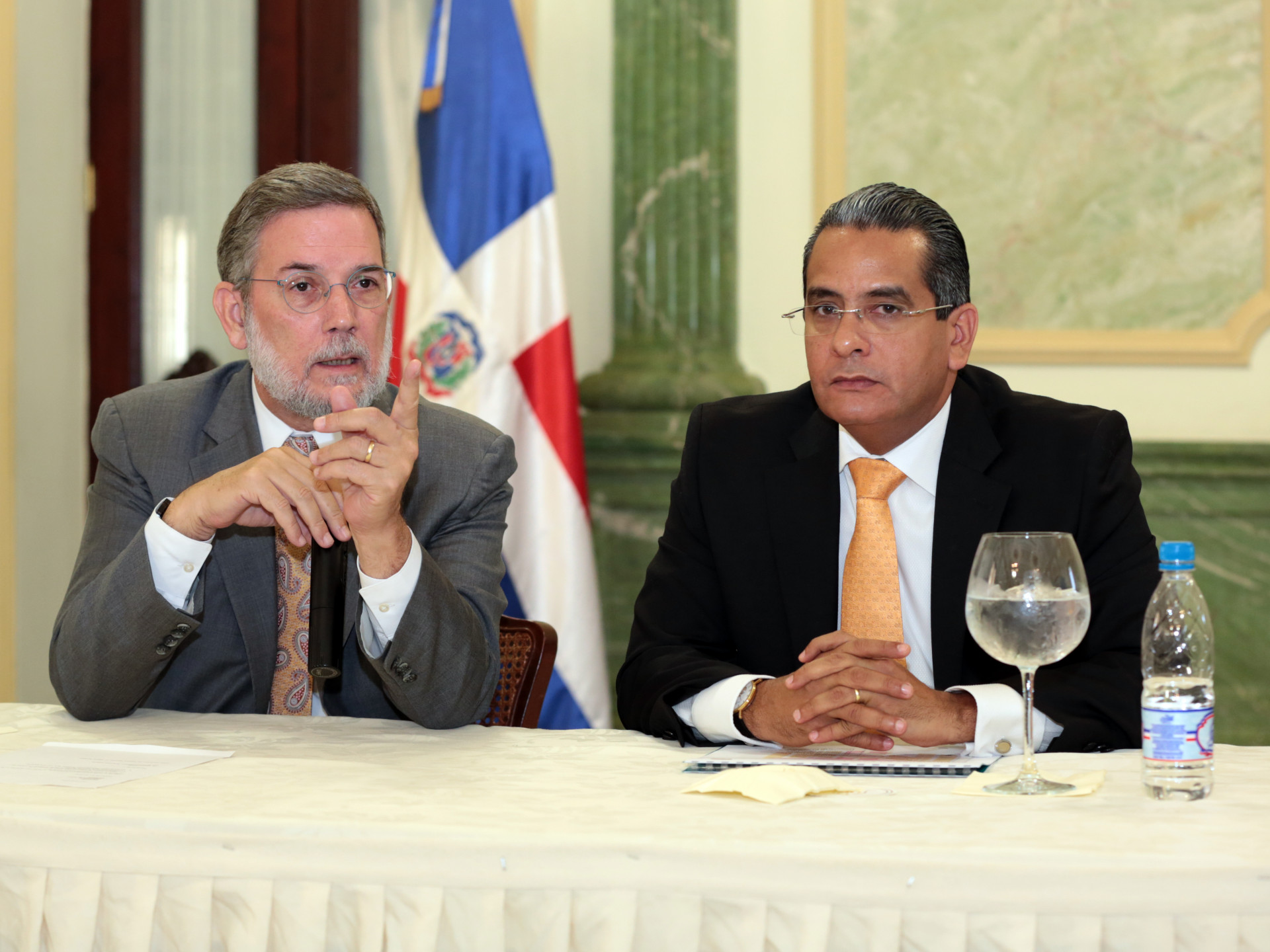 Roberto Rodríguez Marchena, director de la Dirección General de Comunicación de la Presidencia (DICOM) (izquierda) junto al tesorero nacional, Alberto Perdomo, responde a un periodista, en el encuentro semanal con los medios de comunicación, que organiza la DICOM, en el salón Hermanas Mirabal del Palacio Nacional.