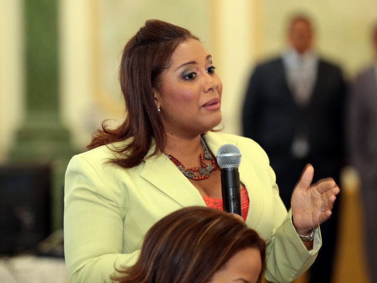 Danilsa Vargas, periodista de SIN, agota un turno y hace una pregunta al tesorero nacional, Alberto Perdomo, en el Encuentro Semanal con los Medios de Comunicación, en el salón Hermanas Mirabal del Palacio Nacional, organizado por la Dirección General de Comunicación (DICOM).