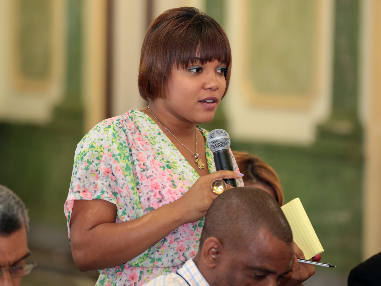 La periodista Cornelia Mota, de la Corporación Estatal de Radio y Televisión (CERTV), hace una pregunta al tesorero nacional, Alberto Perdomo, en el Encuentro Semanal con los Medios de Comunicación, en el salón Hermanas Mirabal del Palacio Nacional, organizado por la Dirección General de Comunicación (DICOM).