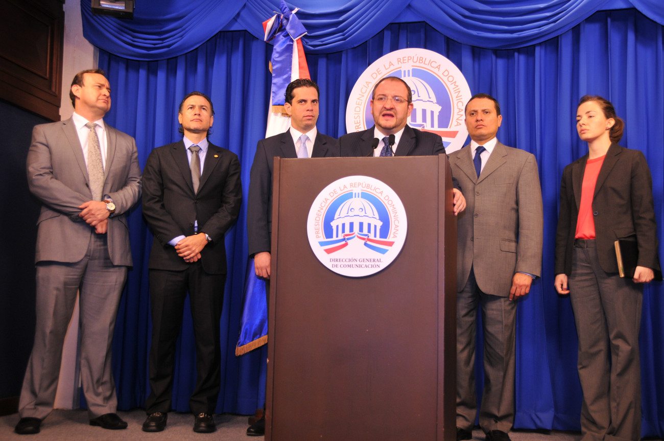 El ministro de Relaciones Exteriores de la República de Guatemala, Luis Fernando Carrera, habla junto a su comitiva, en el salón Orlando Martínez del Palacio Nacional, ante los periodistas, después de reunirse con el presidente Danilo Medina, en el despacho del mandatario dominicano.