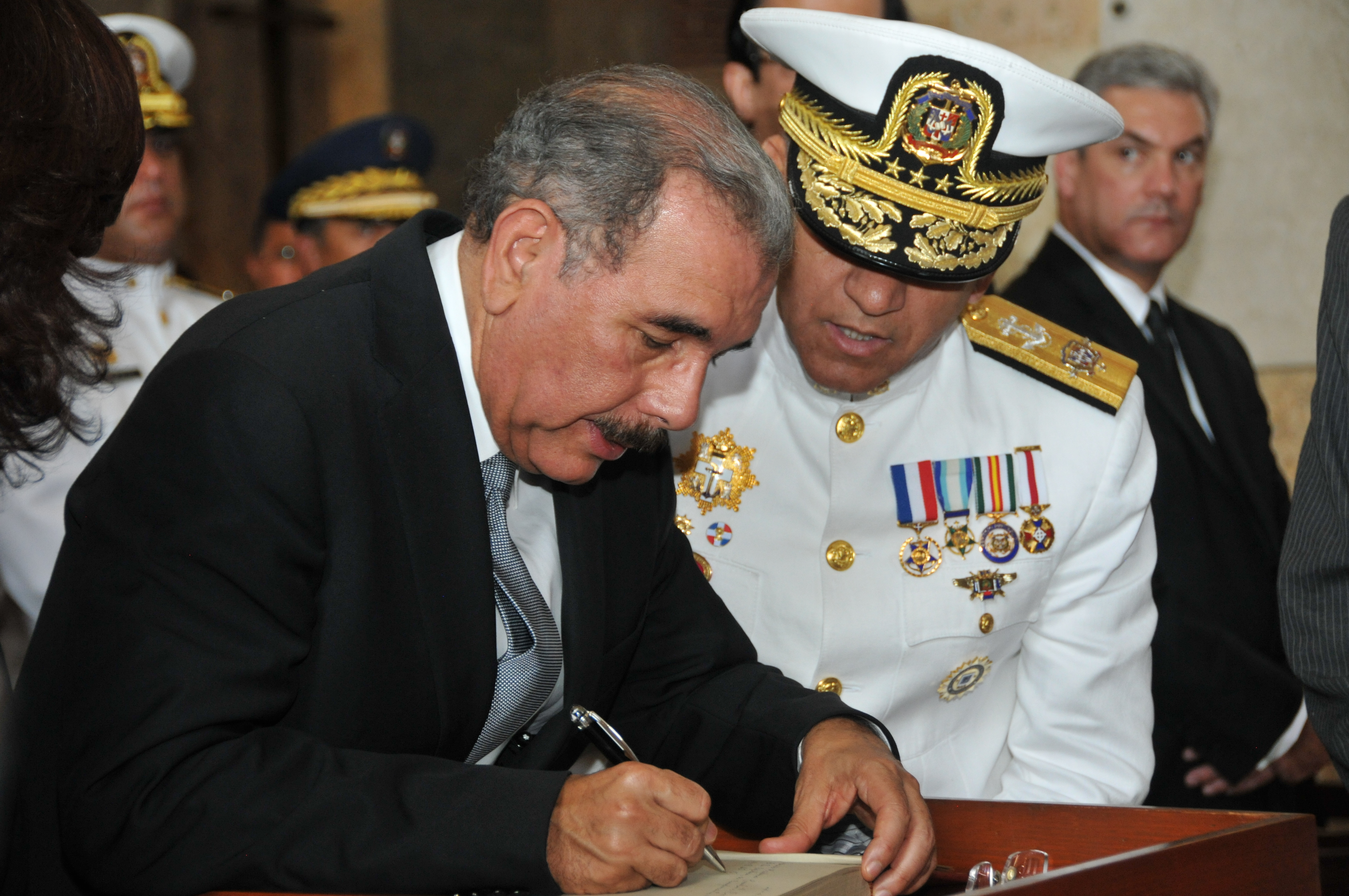 El presidente de la República, Danilo Medina, firma el libro de ofrendas, durante el acto de exaltación al Panteón Nacional del coronel Francisco Alberto Caamaño Deñó.