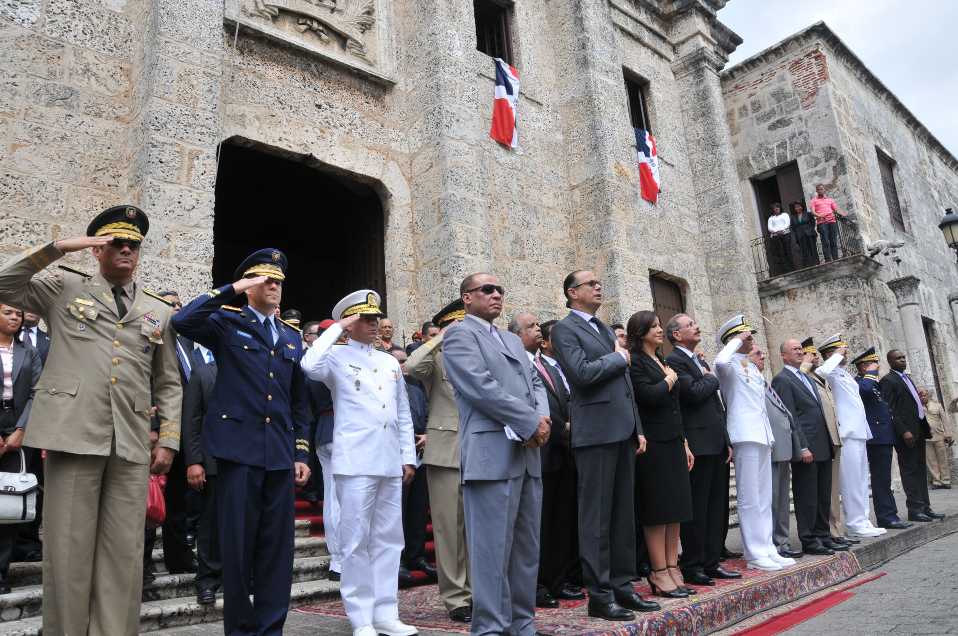 El presidente de la República, Danilo Medina, junto a la vicepresidenta Margarita Cedeño de Fernández y funcionarios civiles y militares, de su Gobierno, recibe los honores militares de estilo, tras la conclusión del acto de exaltación al Panteón Nacional del coronel Francisco Alberto Caamaño Deñó. Foto: Presidencia República Dominicana Nota de prensa: presidencia.gob.do/comunicados/presidente-medina-encabeza...