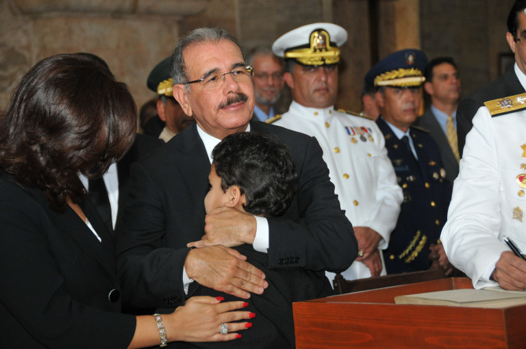 Danilo Medina, presidente de la República, abraza a uno de los nietos del coronel Francisco Alberto Caamaño Deñó, en el acto de exaltación del coronel de abril al Panteón Nacional.
