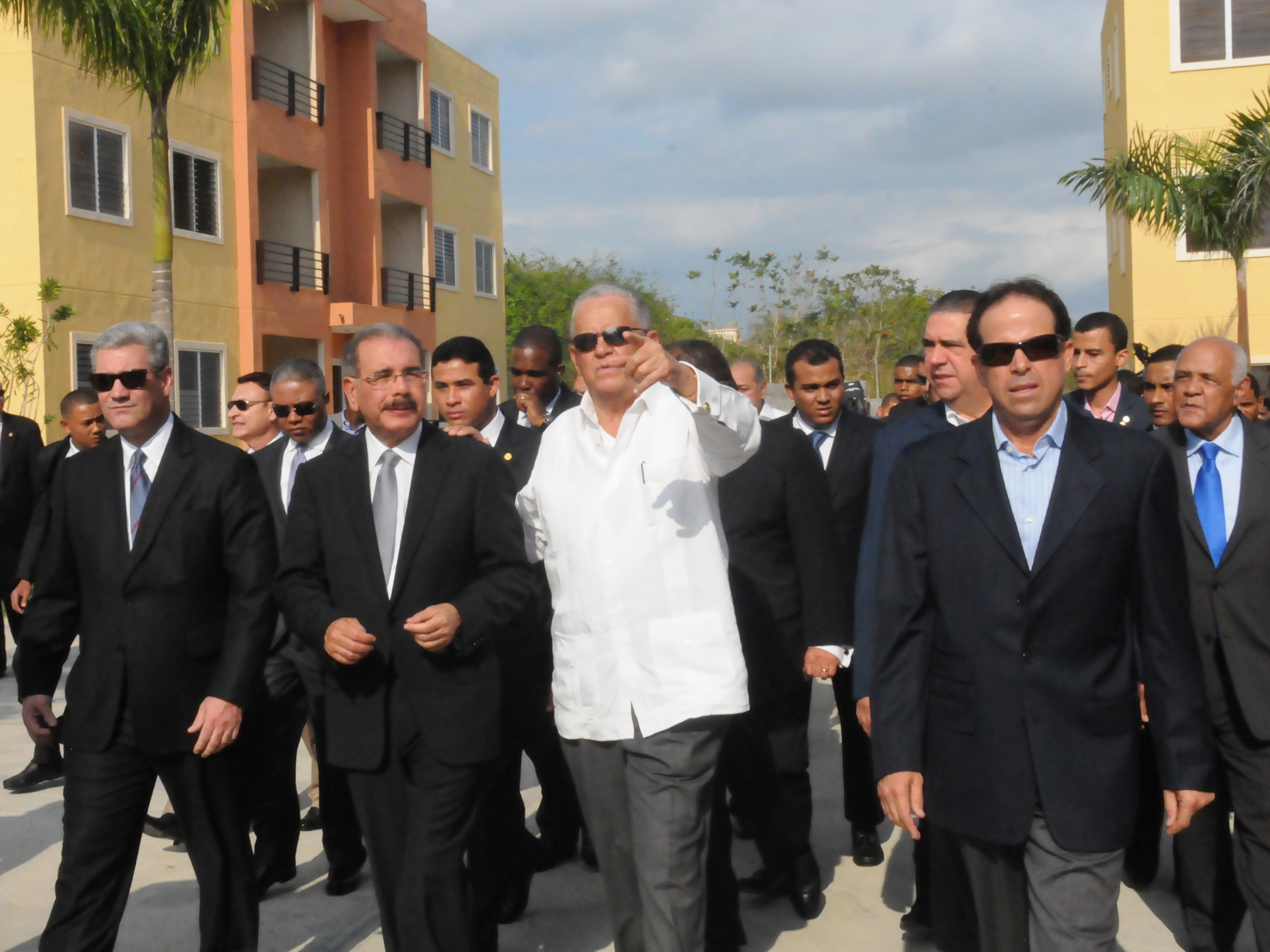 El presidente de la República, Danilo Medina, realiza un recorrido por la primera etapa del proyecto de viviendas Las Bienaventuranzas, en el municipio Santo Domingo Norte, acompañado (a su derecha) por el ministro de Obras Públicas, Gonzalo Castillo; (a su izquierda, con guayabera) Rafael Bisonó, presidente de Constructora Bisonó; entre otros funcionarios del Gobierno.