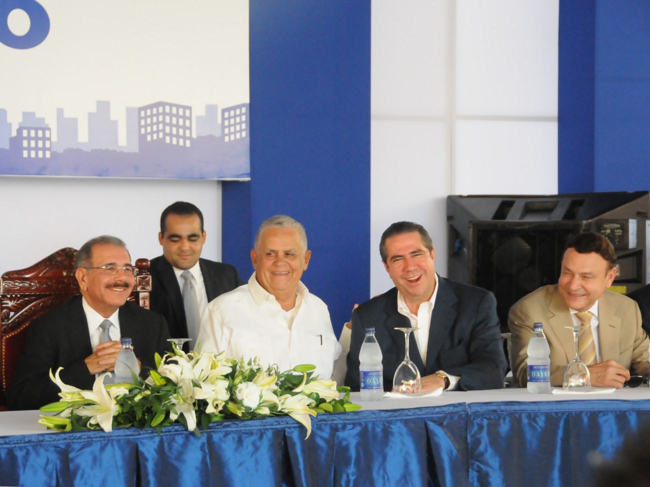 El presidente de la República, Danilo Medina, (primero de izquierda a derecha) comparte en armonía con Rafael Bisonó, presidente de Constructora Bisonó; Francisco Javier García, ministro de Turismo, entre otros, durante la inauguración de la primera etapa del proyecto de viviendas Las Bienaventuranzas, en Santo Domingo Norte, Provincia Santo Domingo.