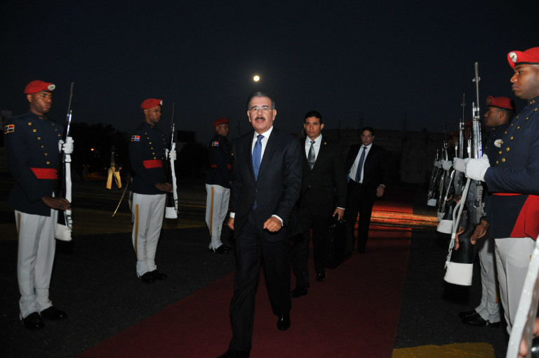 El presidente de la República, Danilo Medina, camina hacia el helicóptero en el cual partirá hacia Puerto Príncipe, Haití, donde participará en la V Cumbre de Jefes de Estado y de Gobierno de la Asociación de Estados del Caribe (AEC).