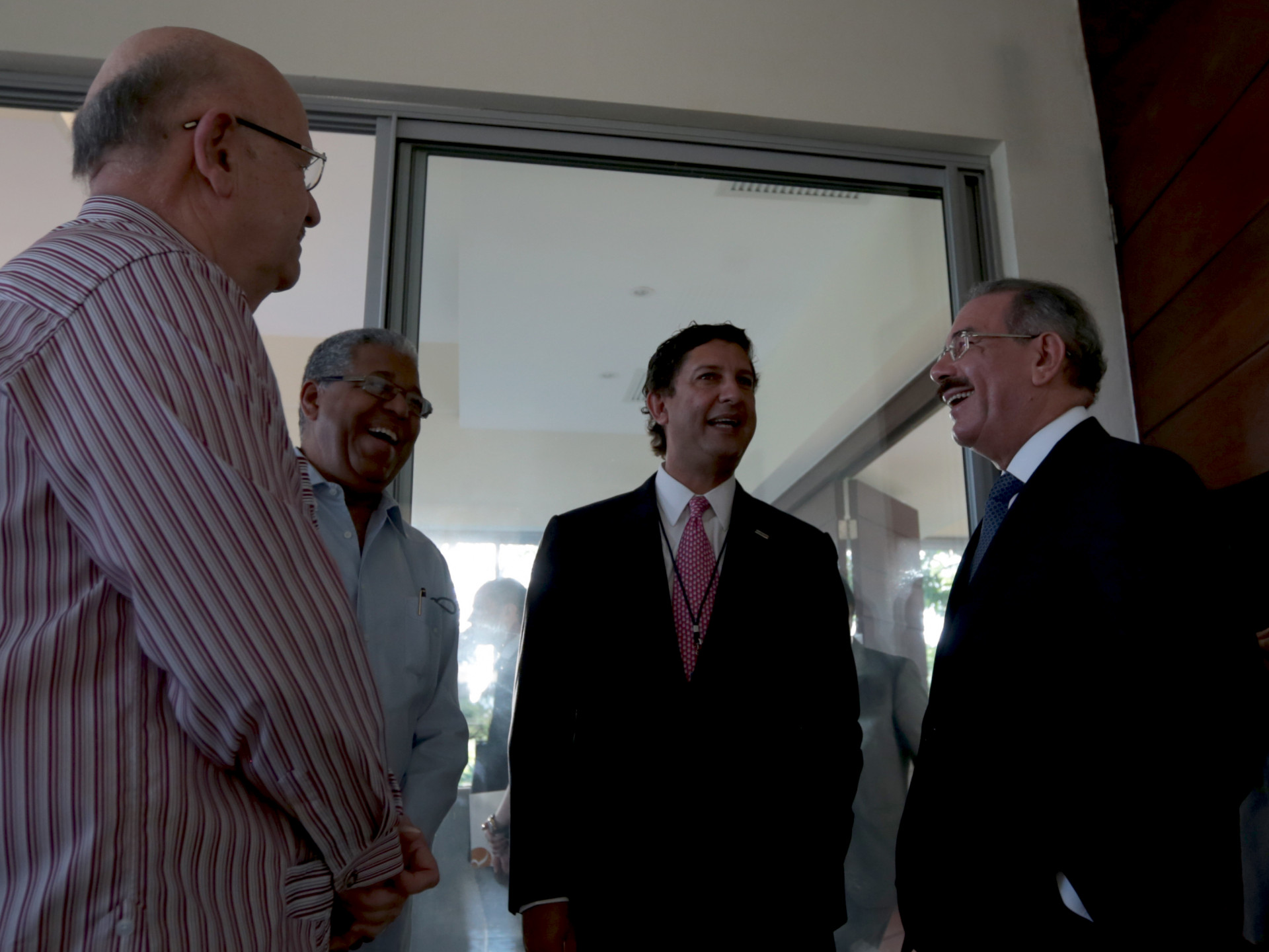 El presidente de la República, Danilo Medina, (derecha) conversa con Manuel Estrella, vicepresidente de Multimedios del Caribe (de frente); Rubén Silié Valdez, embajador dominicano (guayabera); y Carlos Morales Troncos, ministro de Relaciones Exteriores (de espalda), antes del inicio de la V Cumbre de Jefes de Estado y de Gobierno de la Asociación de Estados del Caribe (AEC), en Puerto Príncipe, Haití.