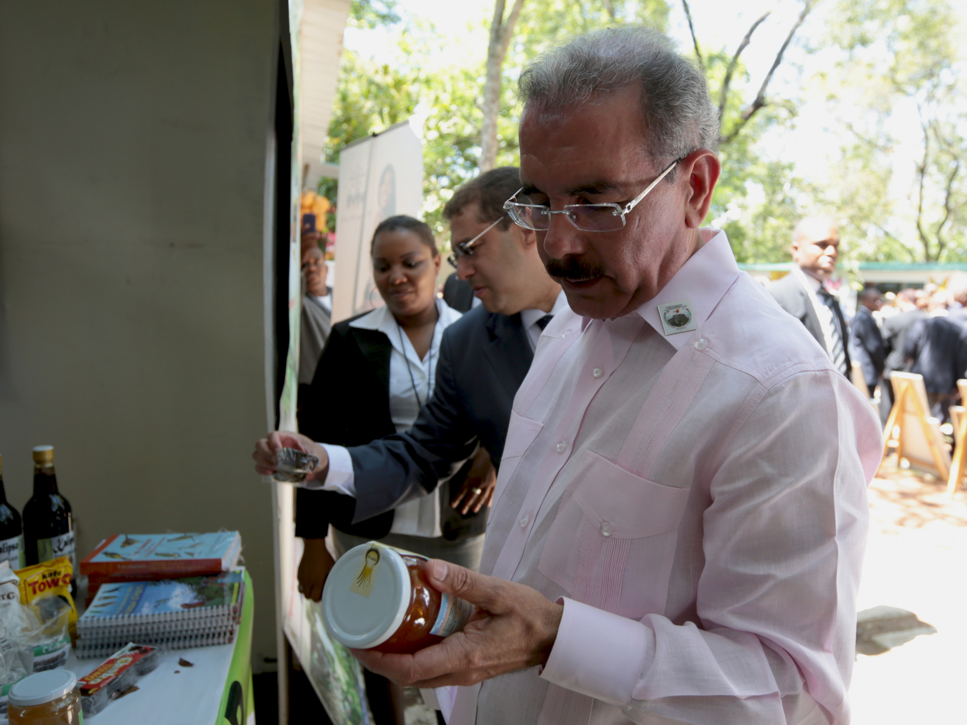El presidente Danilo Medina observa un producto de los que se exhiben en un stand, en la edificación, donde se celebra la V Cumbre de Jefes de Estado y de Gobierno de la Asociación de Estados del Caribe (AEC), en Puerto Príncipe, Haití.