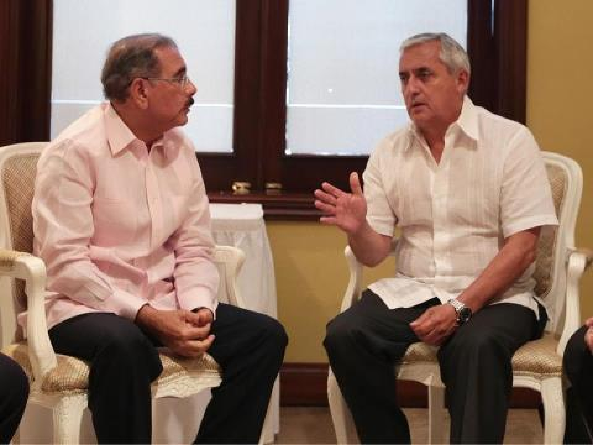 El presidente de la República, Danilo Medina, (izquierda) y Otto Fernando Pérez Molina, presidente de Guatemala, realizan un encuentro bilateral durante la V Cumbre de Jefes de Estado y de Gobierno de la Asociación de Estados del Caribe (AEC), que se celebra en Puerto Príncipe, Haití.
