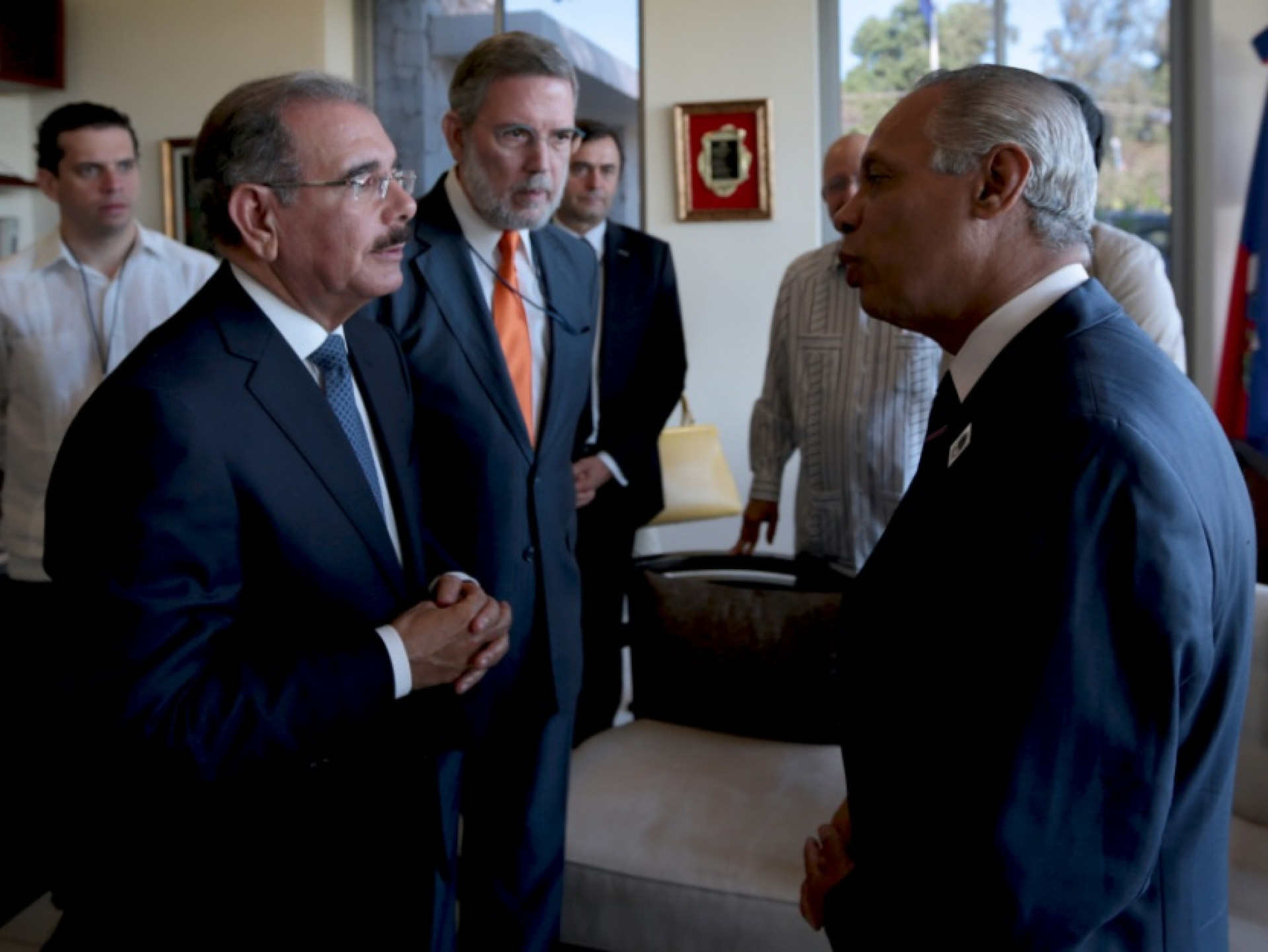 El presidente de la República, Danilo Medina, dialoga con Victorin Lurel, ministro de Cooperación Francés, previo al inicio de la V Cumbre de Jefes de Estado y de Gobierno de la Asociación de Estados del Caribe (AEC), en Puerto Príncipe, Haití.