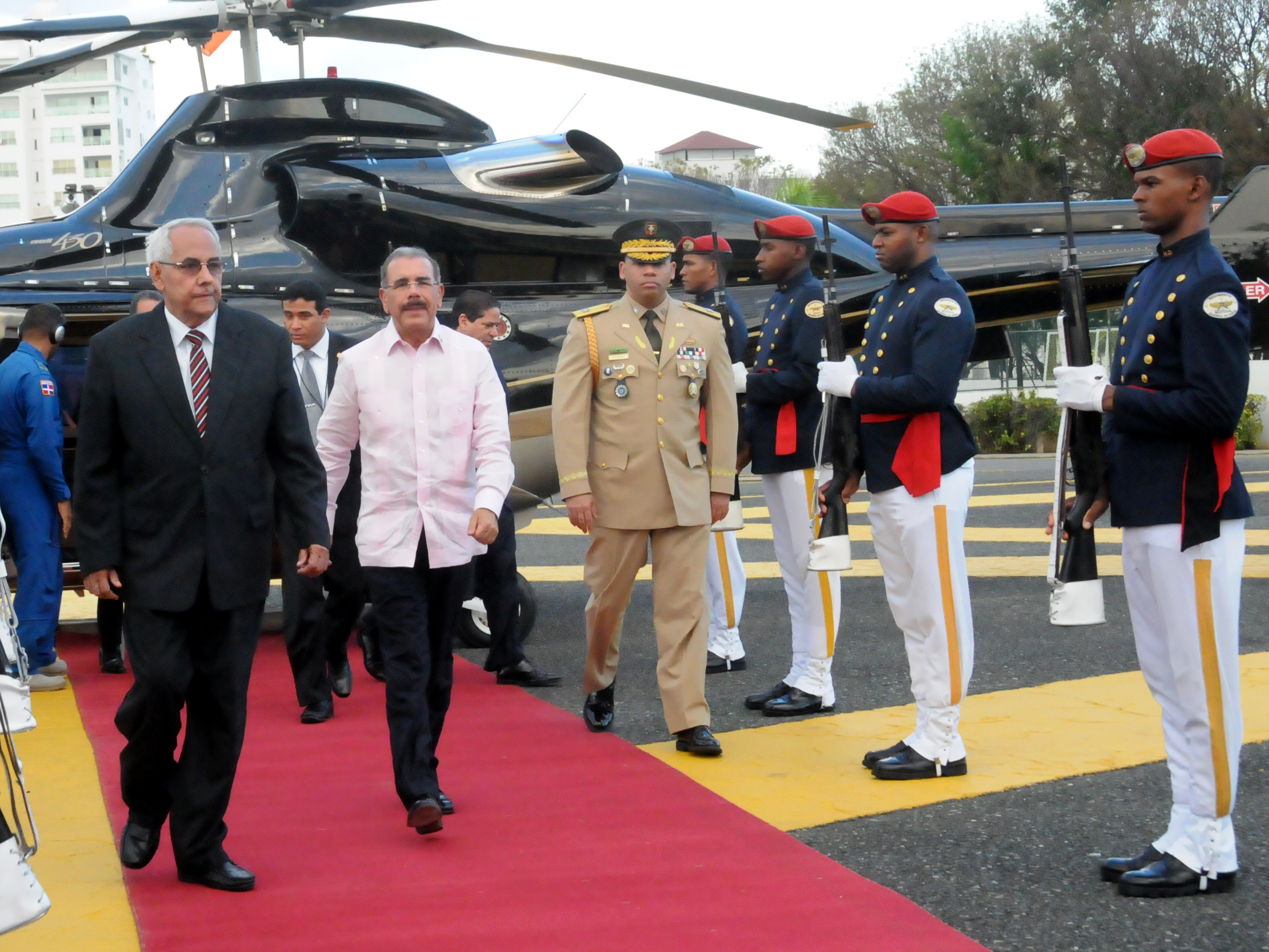 El presidente Danilo Medina recibe los honores militares a su llegada al país, luego de participar en la V Cumbre de Jefes de Estado y de Gobierno de la Asociación de Estados del Caribe (AEC), celebrada en Puerto Príncipe, Haití.