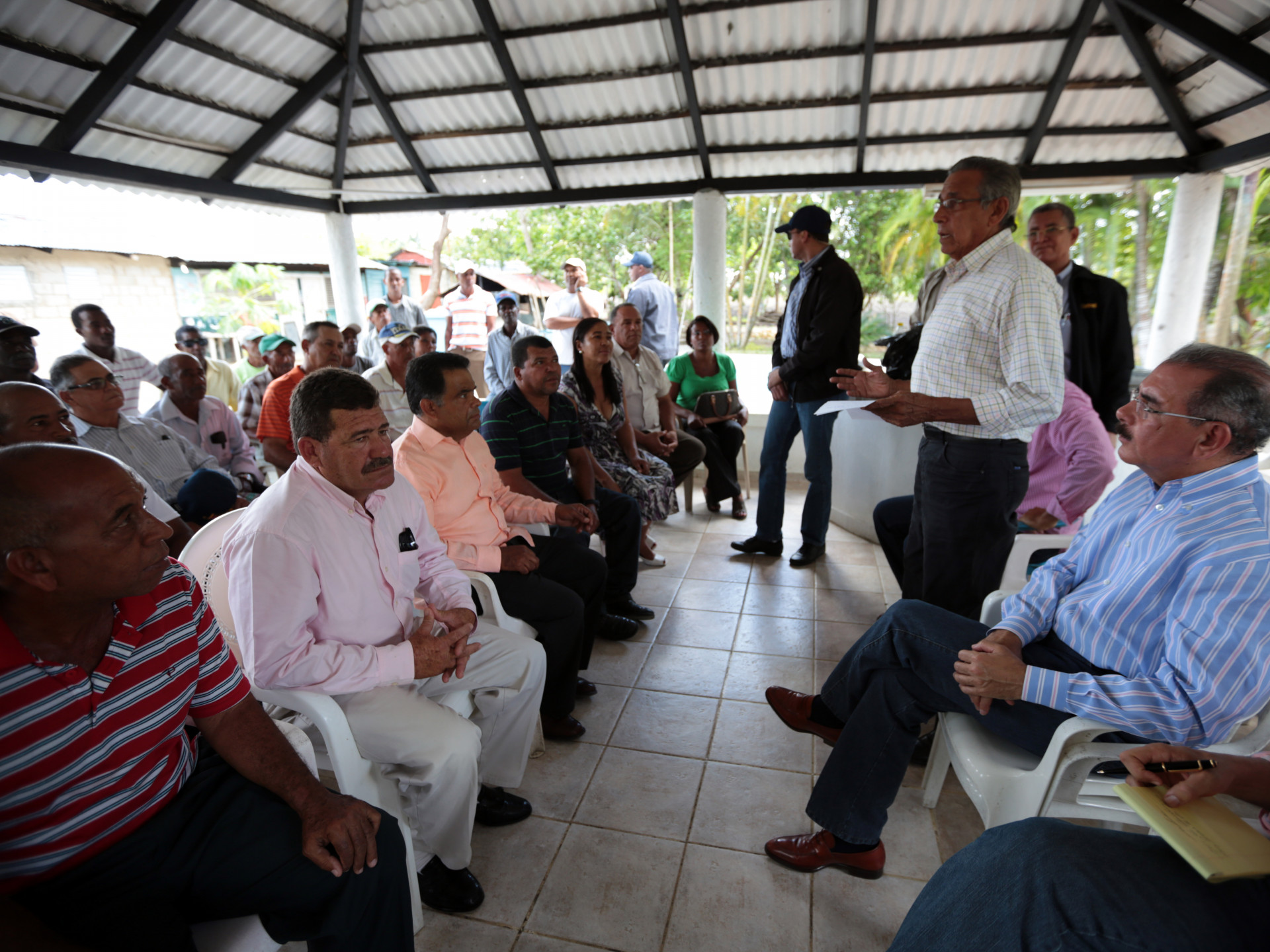 Dirigentes de una de las tres asociaciones de productores agropecuarios de Los Llanos, San Pedro de Macorís, explican al presidente Danilo Medina la situación y dificultades que tienen para desarrollar su producción.