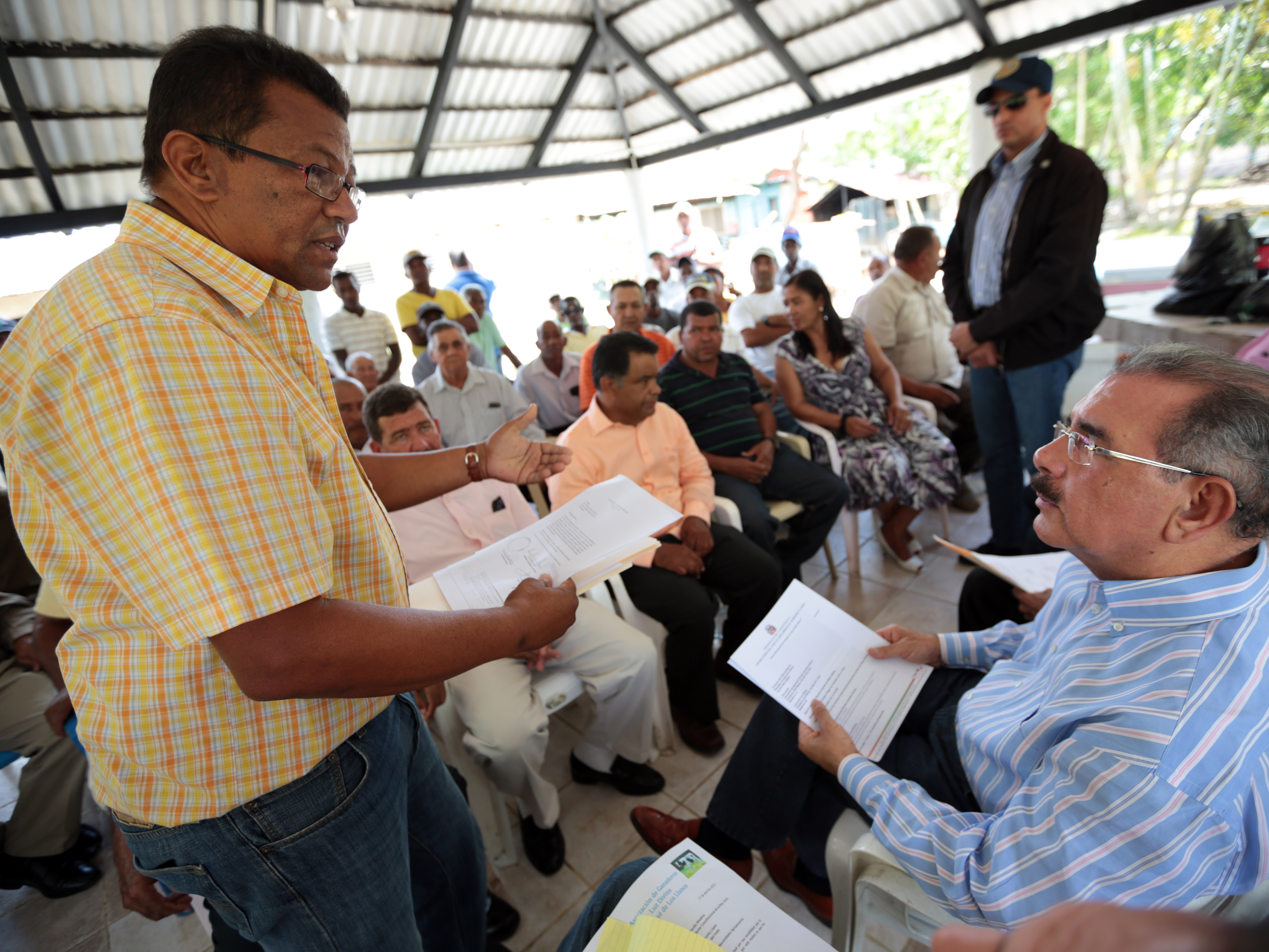 El presidente de la República, Danilo Medina, escucha a uno de los dirigentes de una de las tres asociaciones de productores agropecuarios de Los Llanos, San Pedro de Macorís, quien explica la situación y dificultades que tienen para desarrollar su producción.