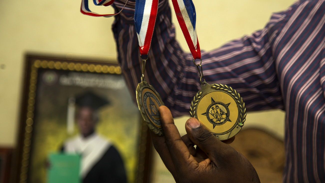 Angelot Dieudonné Rodríguez, muestra con orgullo sus certificados, medallas y reconocimientos obtenidos como estudiante meritorio en territorio dominicano.