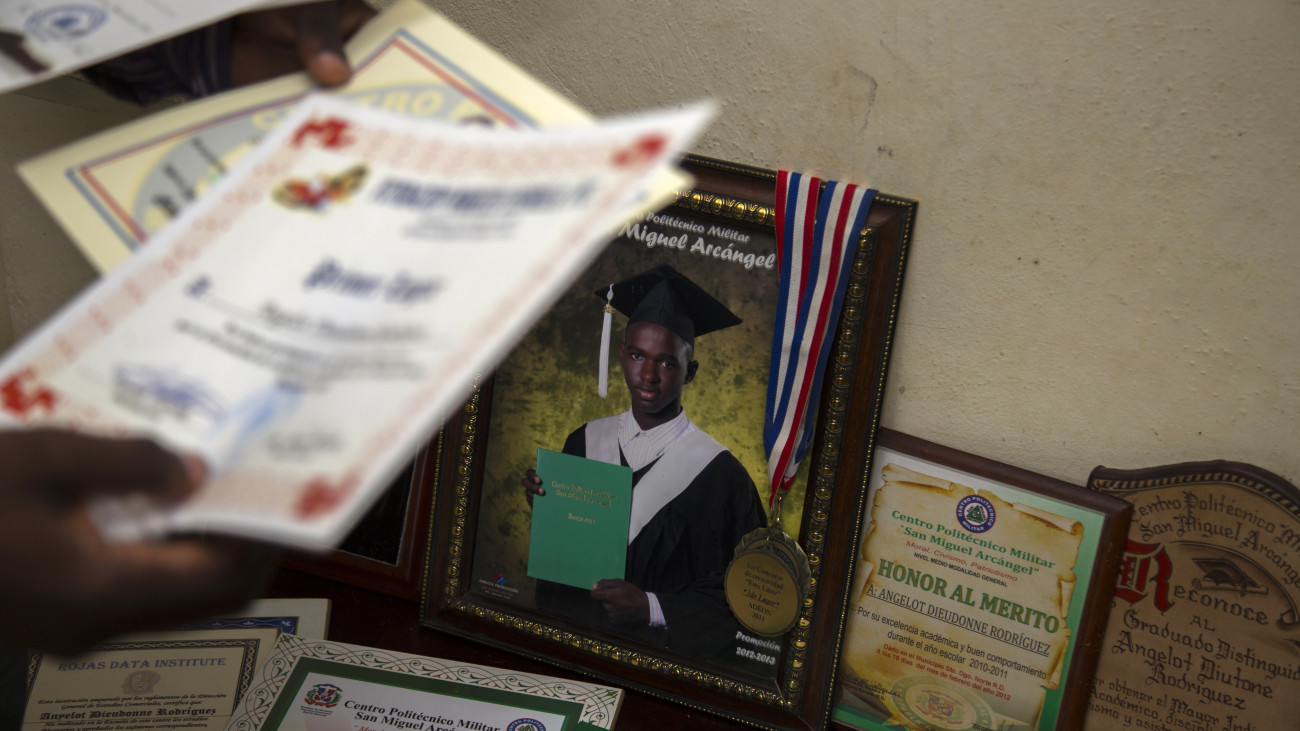 Angelot Dieudonné Rodríguez, muestra con orgullo sus medallas, certificados y reconocimientos obtenidos como estudiante meritorio en territorio dominicano.