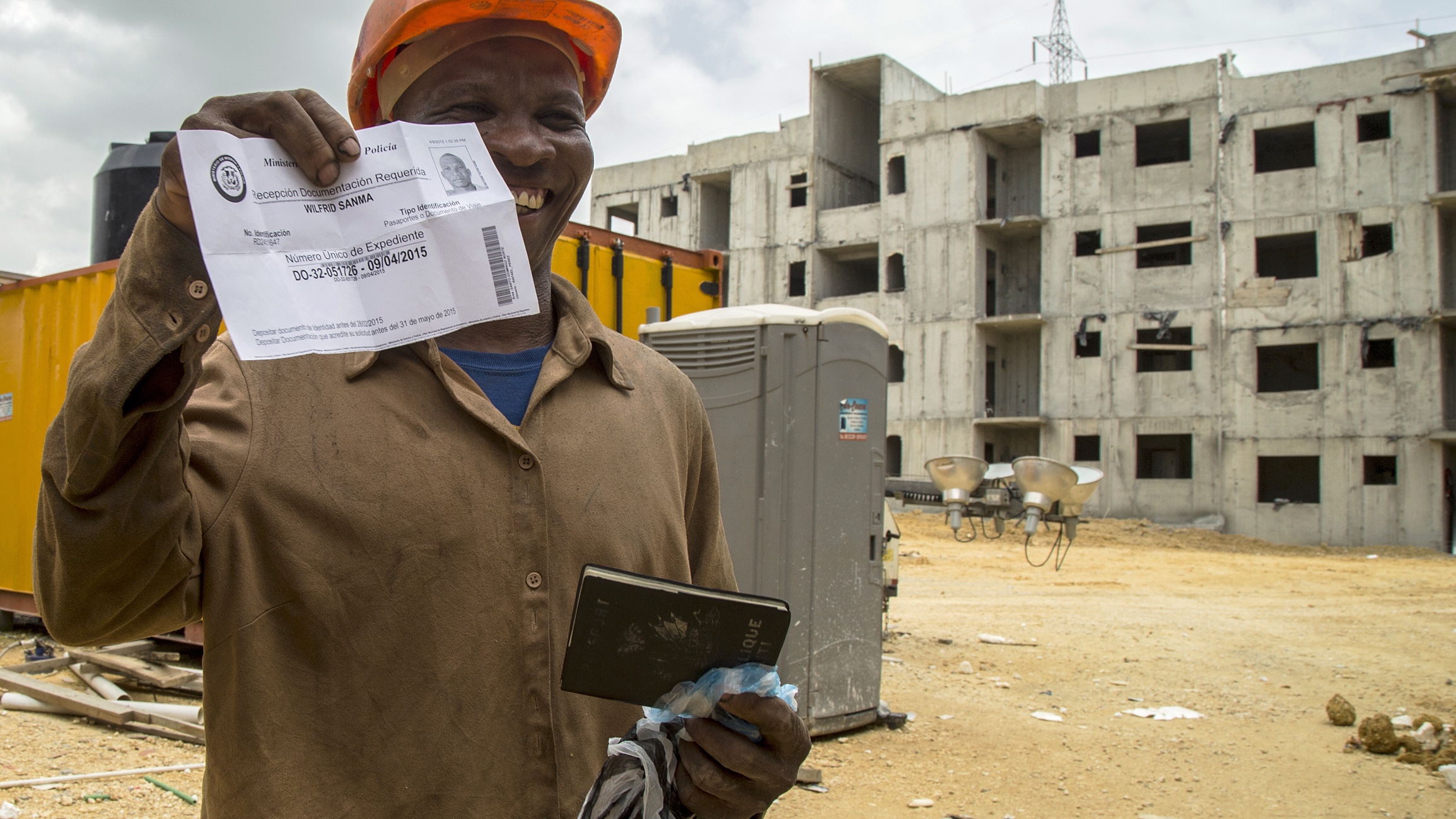 Wilfrid Sanma, obrero de la construcción, sonríe mientras presenta su papel obtenido "Sin proléme, sin bulla".