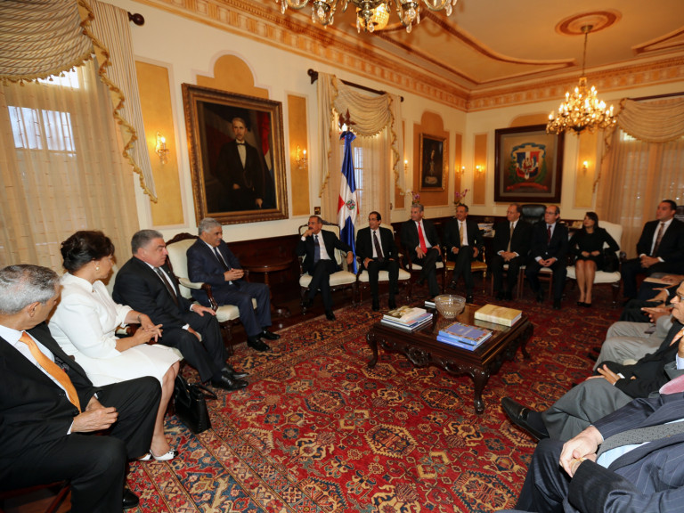 El presidente de la República, Danilo Medina, junto a una amplia comisión del Partido Revolucionario Dominicano (PRD) encabezada por Miguel Vargas Maldonado, presidente de esa organización política, en su despacho del Palacio Nacional.