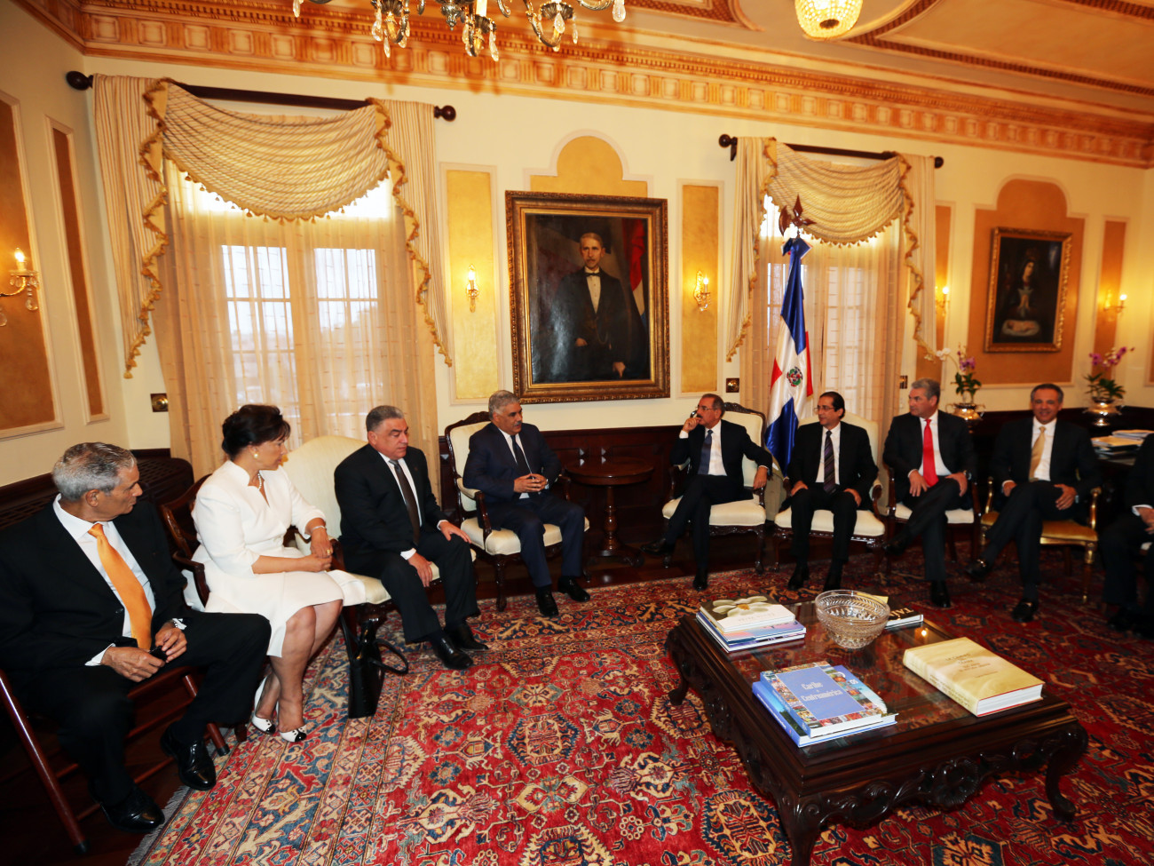 El presidente de la República, Danilo Medina, (a la derecha de la Bandera Nacional) recibe una amplia comisión del Partido Revolucionario Dominicano (PRD) encabezada por Miguel Vargas Maldonado, presidente de esa organización política, en su despacho del Palacio Nacional. Foto: Presidencia República Dominicana Nota de prensa: presidencia.gob.do/comunicados/prioridades-del-presidente...
