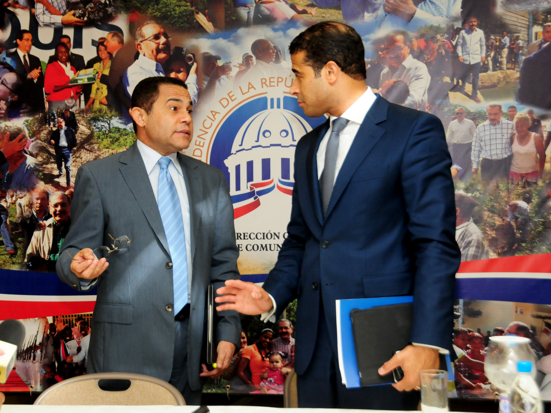 Rafael Ovalles, subdirector de DICOM y José Dantés Díaz, director ejecutivo de la Comisión Permanente de Titulación de Terrenos del Estado, previo a ocupar sus asientos en la mesa principal, en el salón Hermanas Mirabal, donde la Dirección General de Comunicación organiza el encuentro semanal con los medios de comunicación, en el Palacio Nacional.