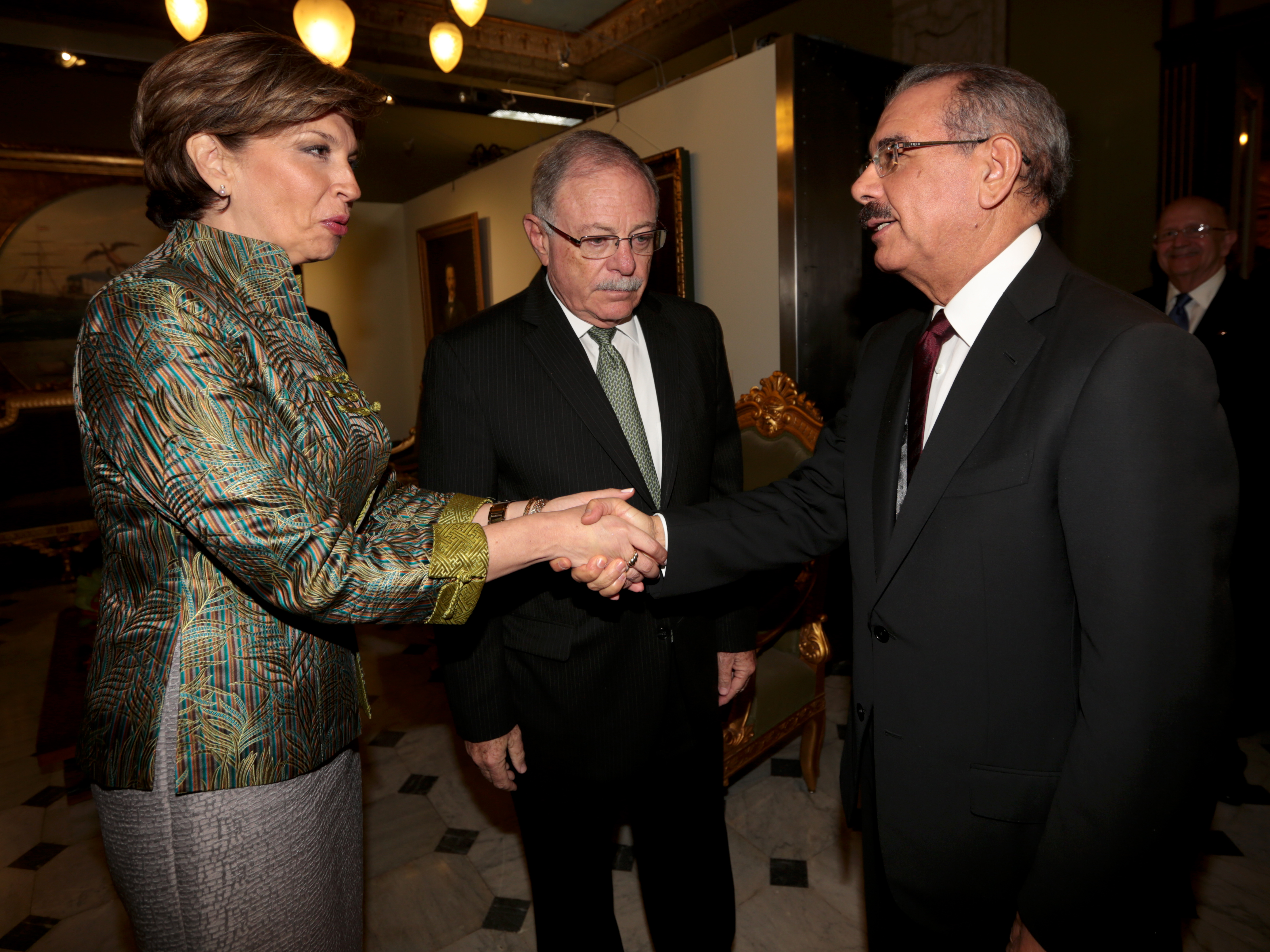 El presidente de la República, Danilo Medina, saluda a Mayi Antillón, ministra de Economía de Costa Rica, a su entrada al Teatro Nacional, de ese país centroamericano, donde se lleva a cabo la Cumbre del Sistema de la Integración Centroamericana y de Estados Unidos (SICA-EEUU). presidencia.gob.do/comunicados/pocas-horas-y-mucho-trabajo